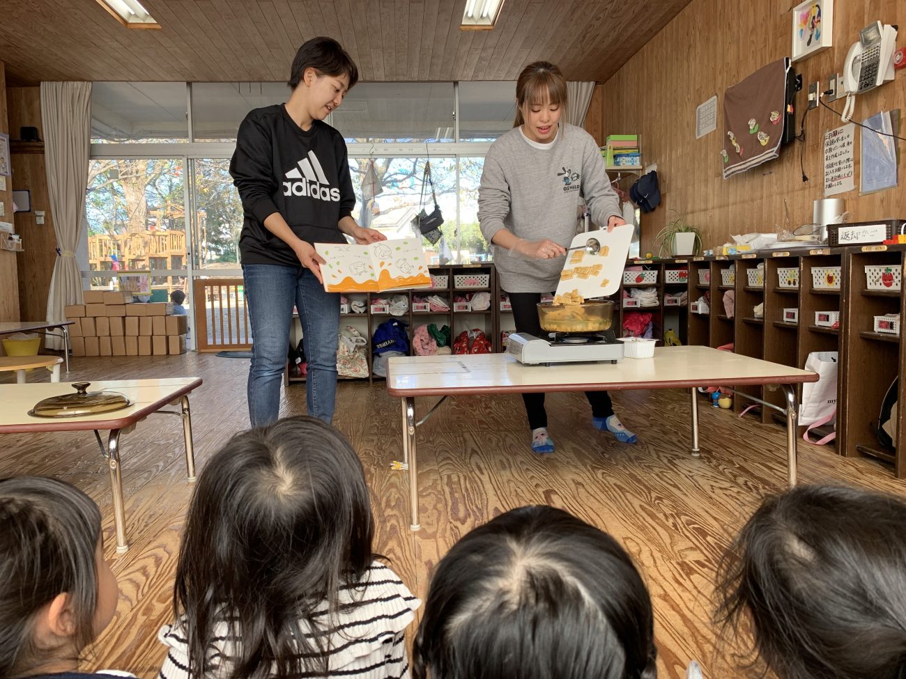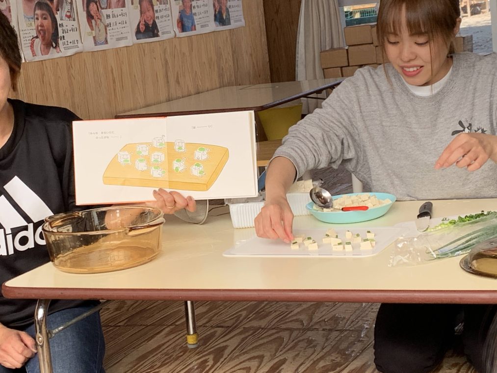 そして、豆腐を切る作業を1人ずつ手伝ってもらいながら、絵本と照らし合わせて調理を進めていきました。