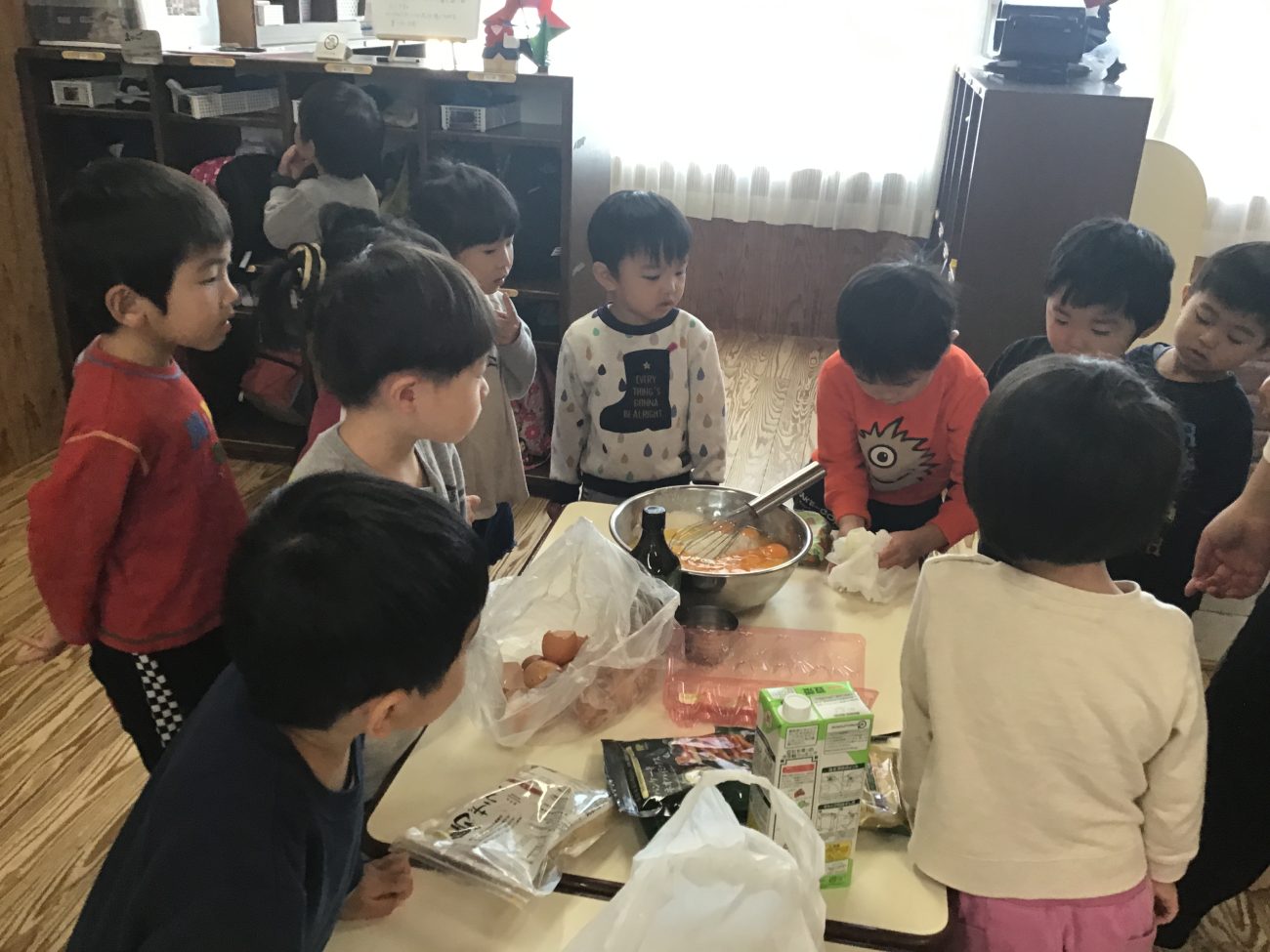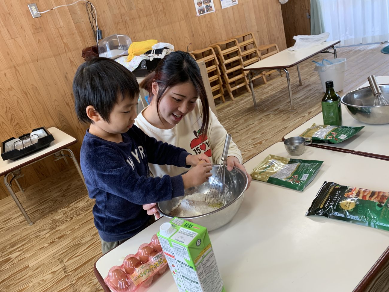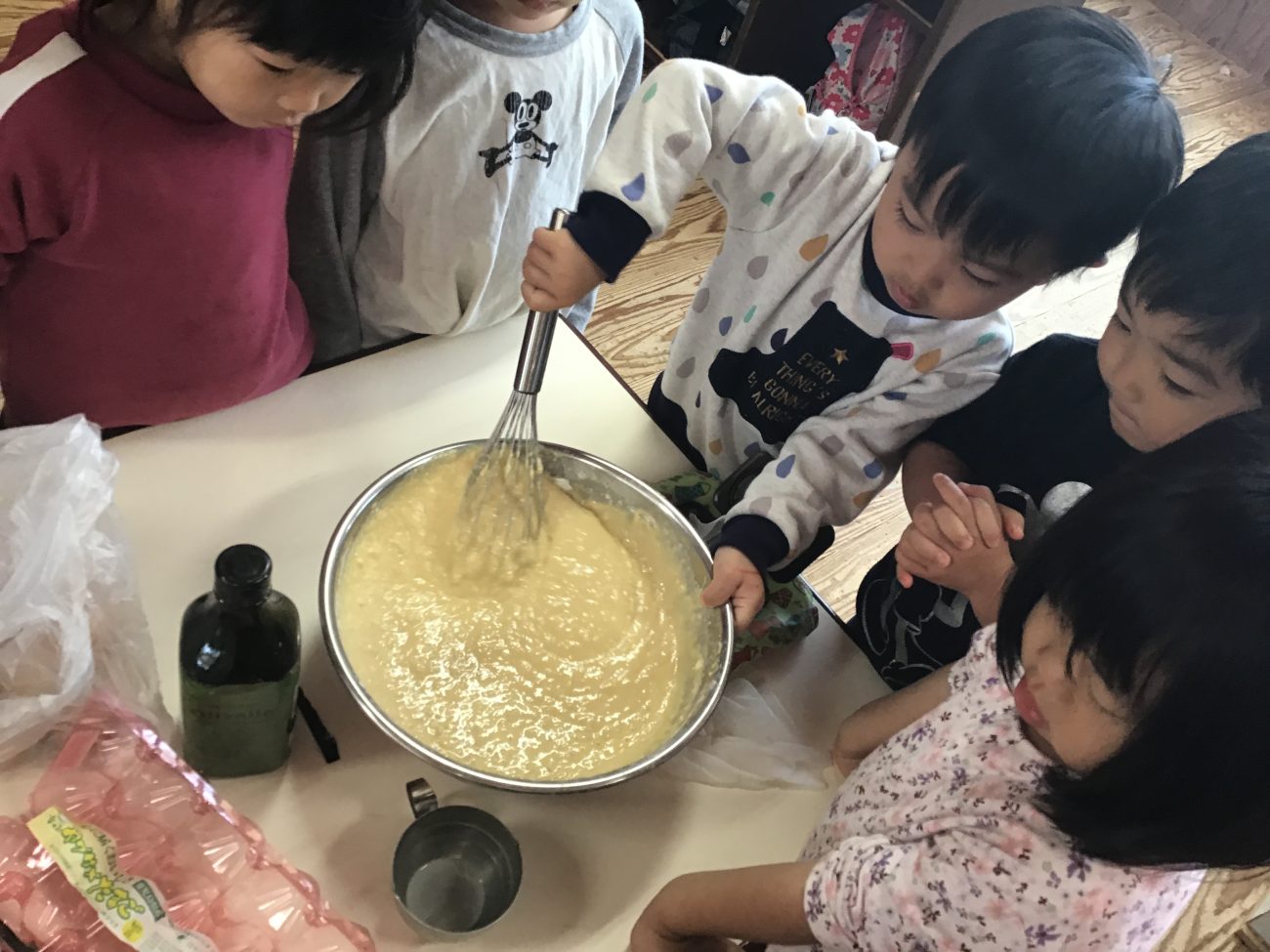 卵を割る作業もお手伝いをしてもらい、子ども達はお家で卵割りのお手伝いしているのか割り方を知っている子が多く、殻がボールの中に入りながらも上手に割ることが出来ていました。