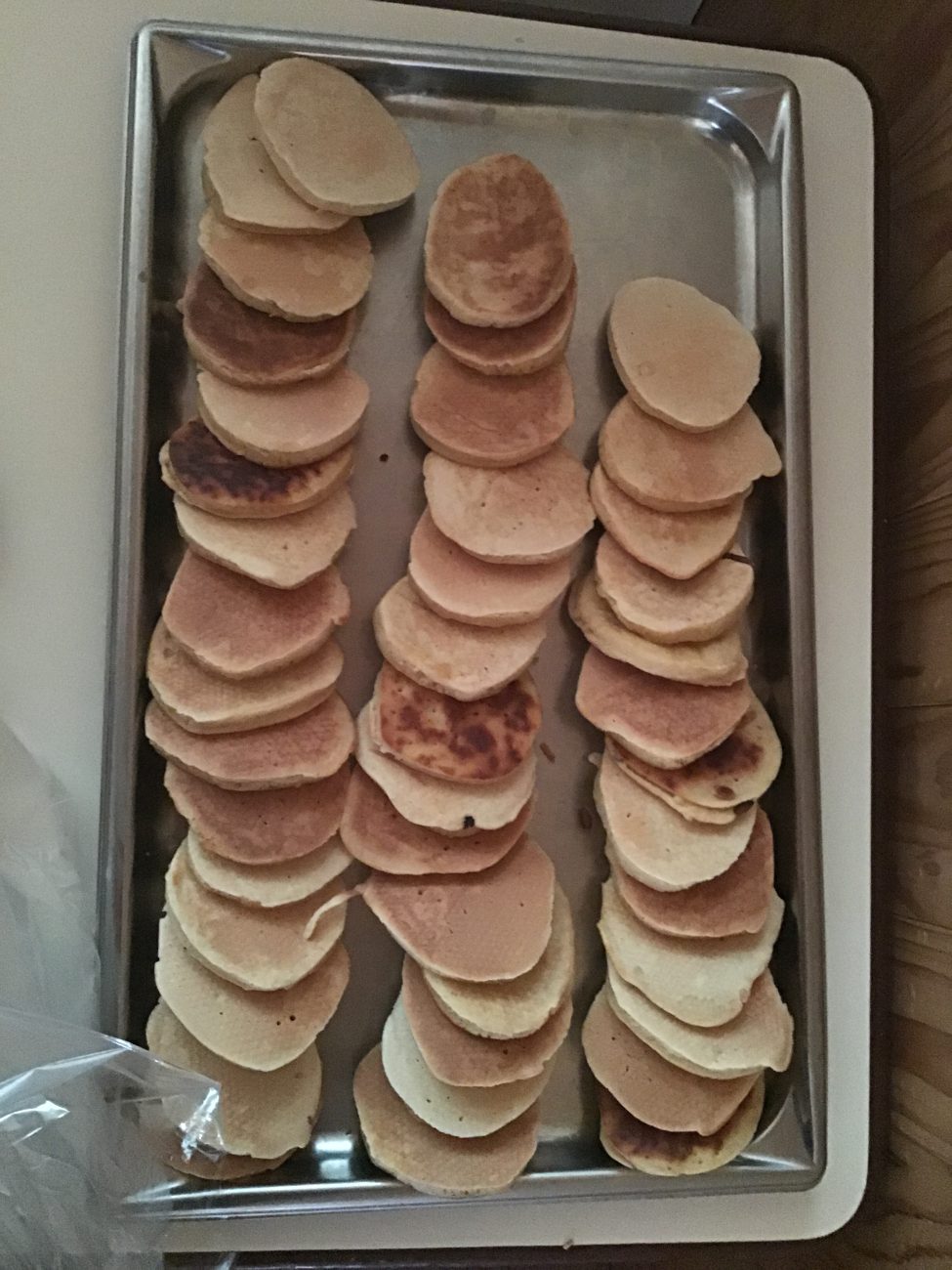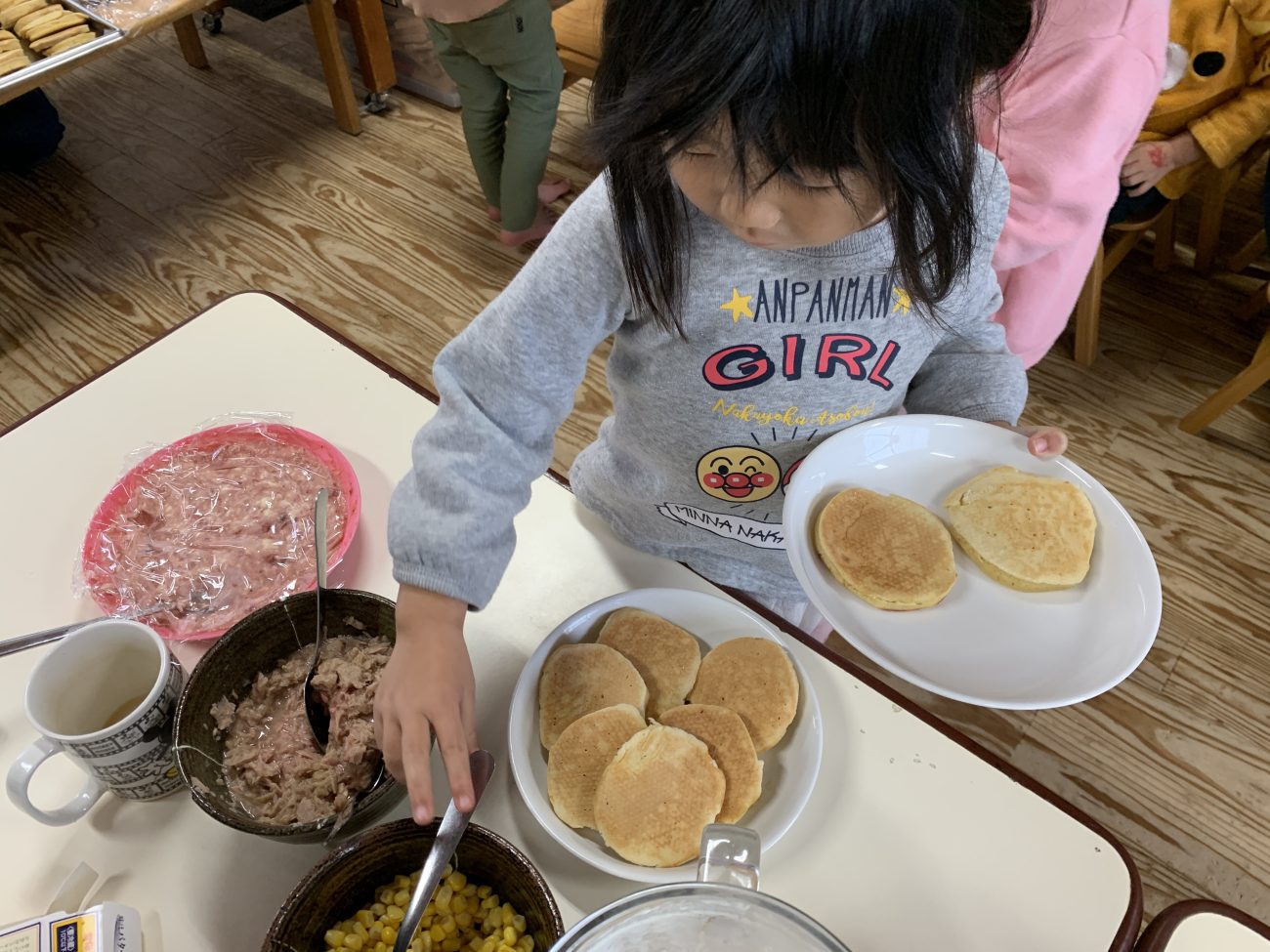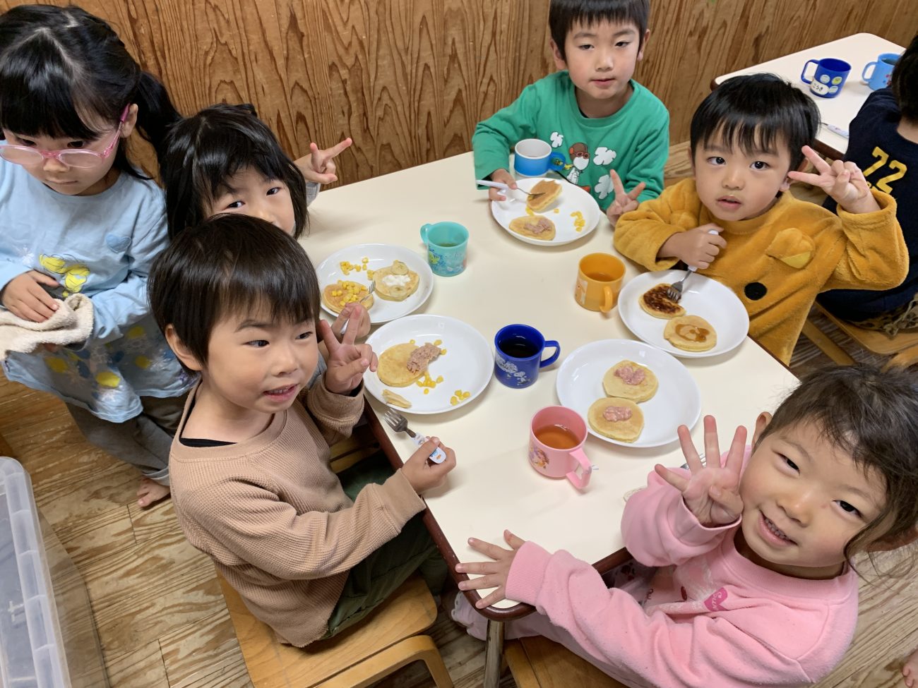 食べる事が好きな子ども達だからこそ、ホットケーキの大きさや厚さが均等になるよう、牛乳パックで作った丸い型を用意することにしました。その結果、大きさ・形が同じだった為全員が納得した様子で楽しそうに食べる姿が見られました。