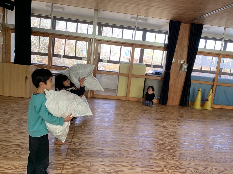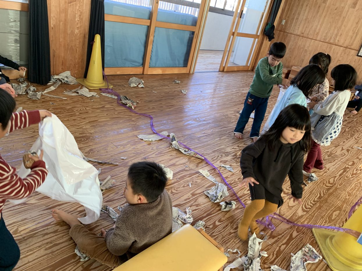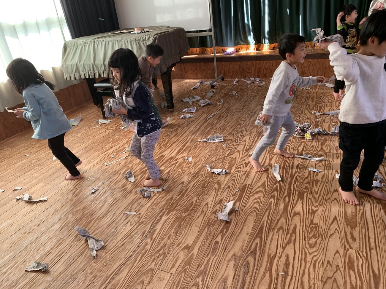 12月、もも組の子ども達と新聞紙遊びを行いました。子ども達にとっては久しぶりの新聞紙遊びでしたが、新聞紙の性質を遊びながら学んだり一つの目的を持って友達と言葉を交わしたり応援したりとしていました。