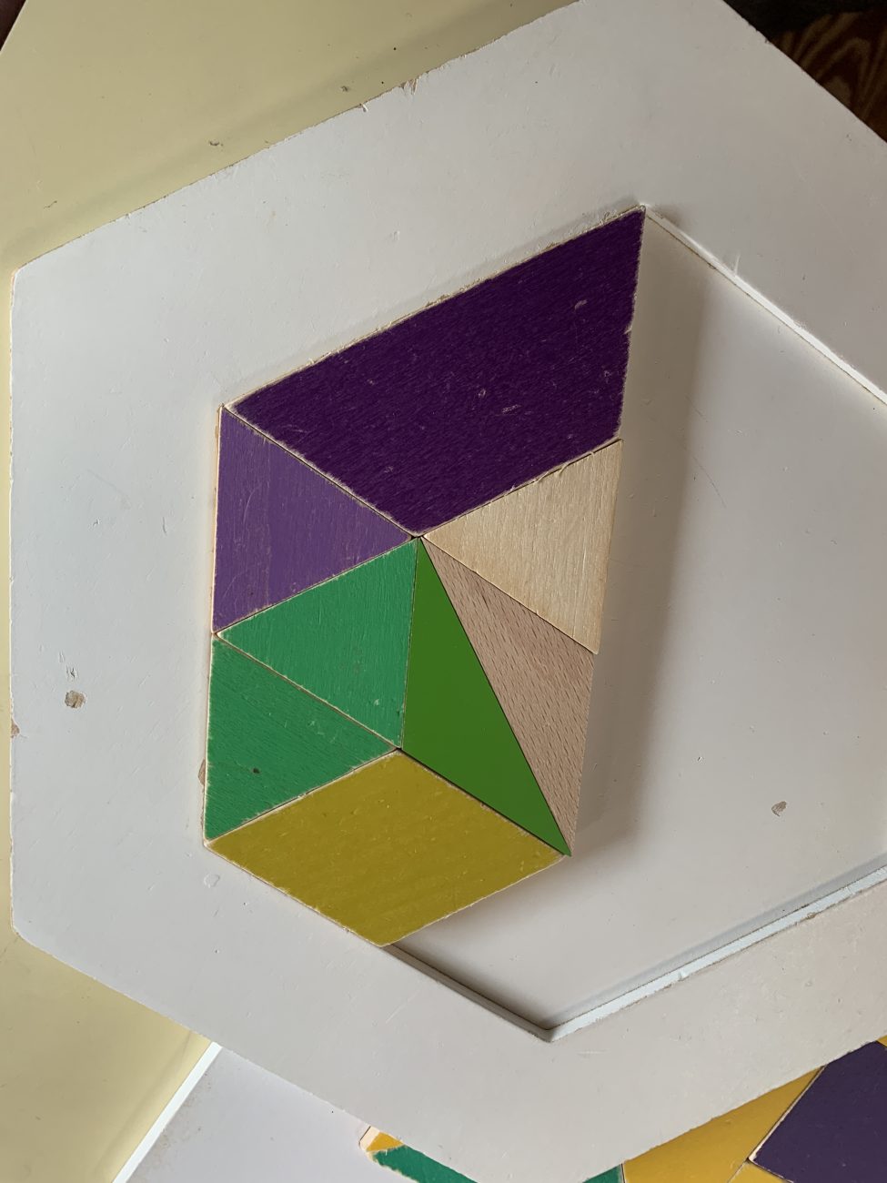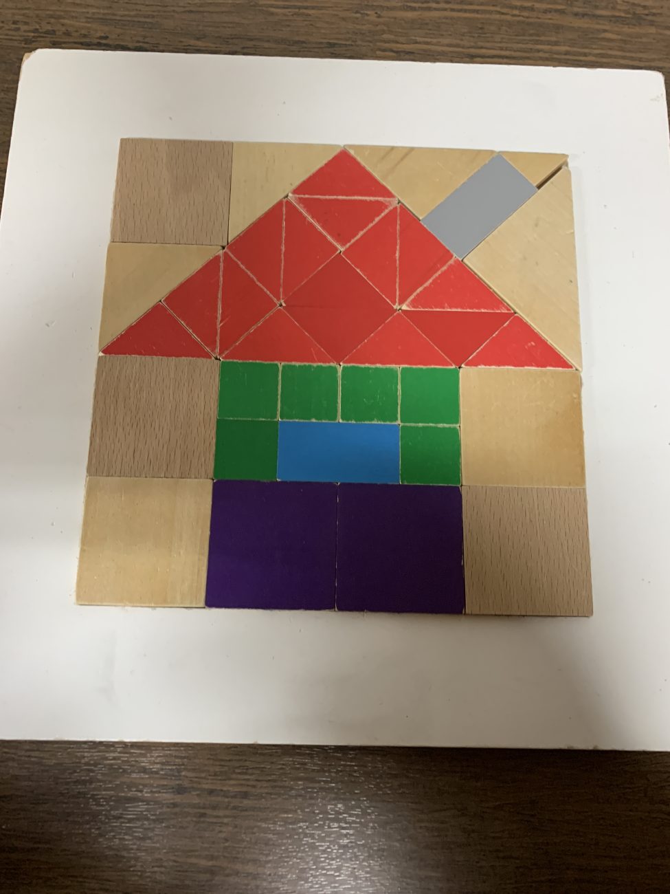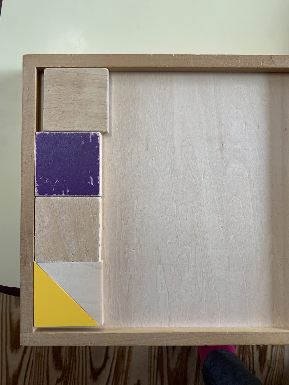 これは3、4、5歳児向けの遊び方になります。”変身の術 “を使い、4つの三角形が四角形に。2つの長方形が四角形になるなど、形の変化に気づいていきます。三角→四角 長方形→四角は算数の方式の学びになり、いろんな形を四角形のトレイや六角形のトレイにはめる面白さにも繋がっていきます。