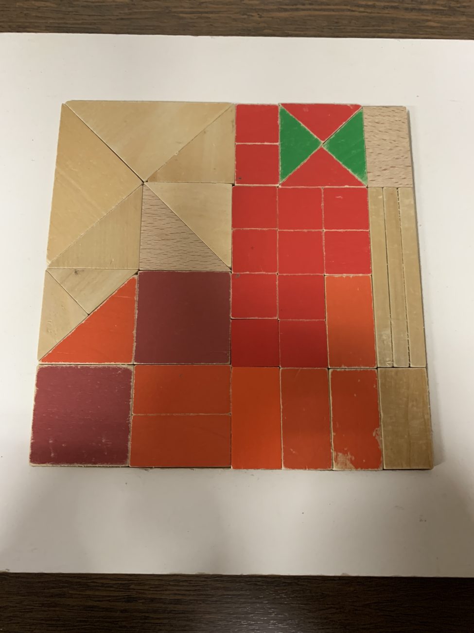 色彩の全ての要素と、正方形、正六角形から生まれる幾何学的な形体を網羅した構成童具です。