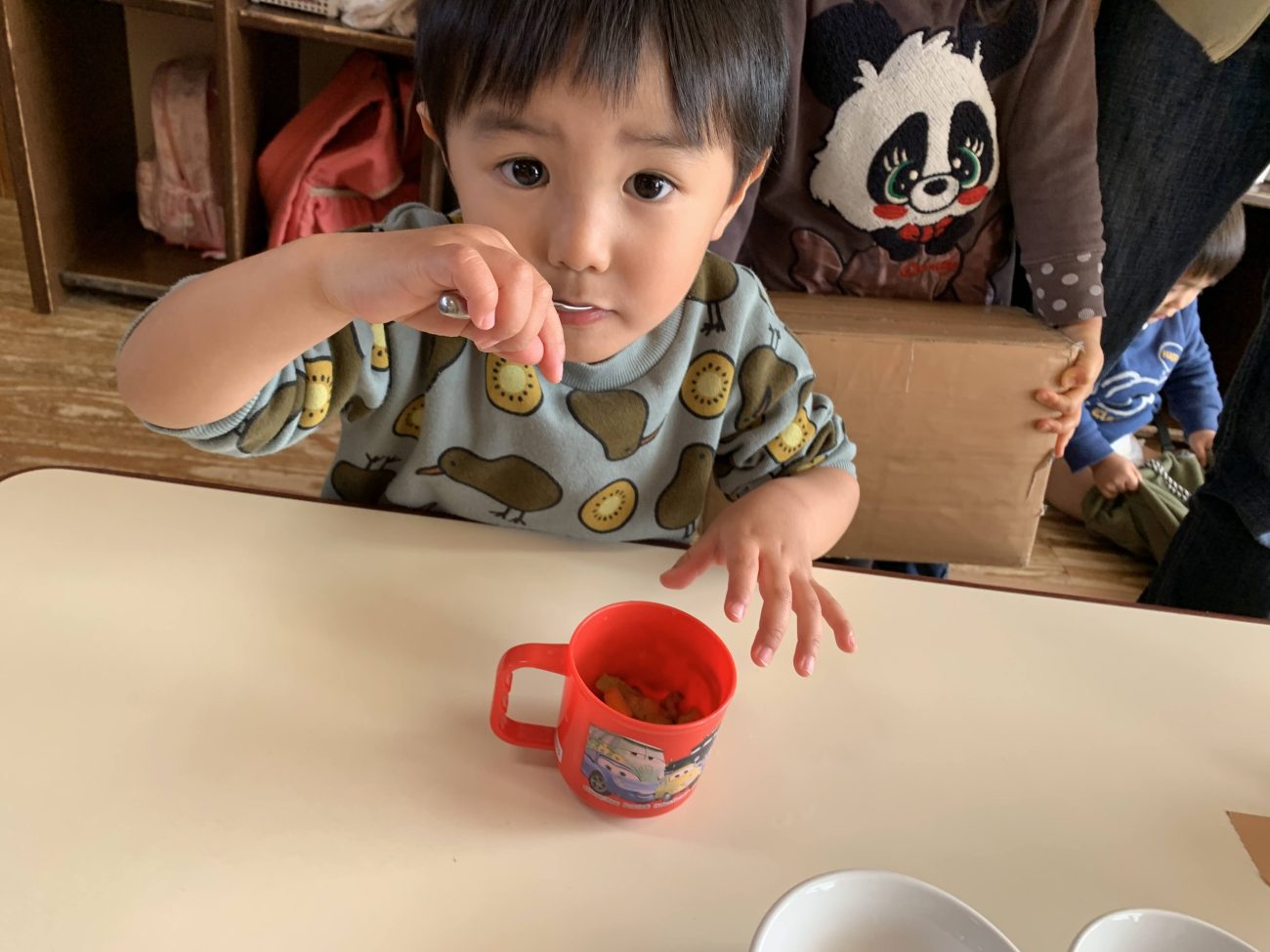 食べている中で友達と「これは〇〇ちゃんが切ったやつかな?おいしいね!」と会話を楽しみながら食べることが出来て楽しい時間を送ることが出来ていました。