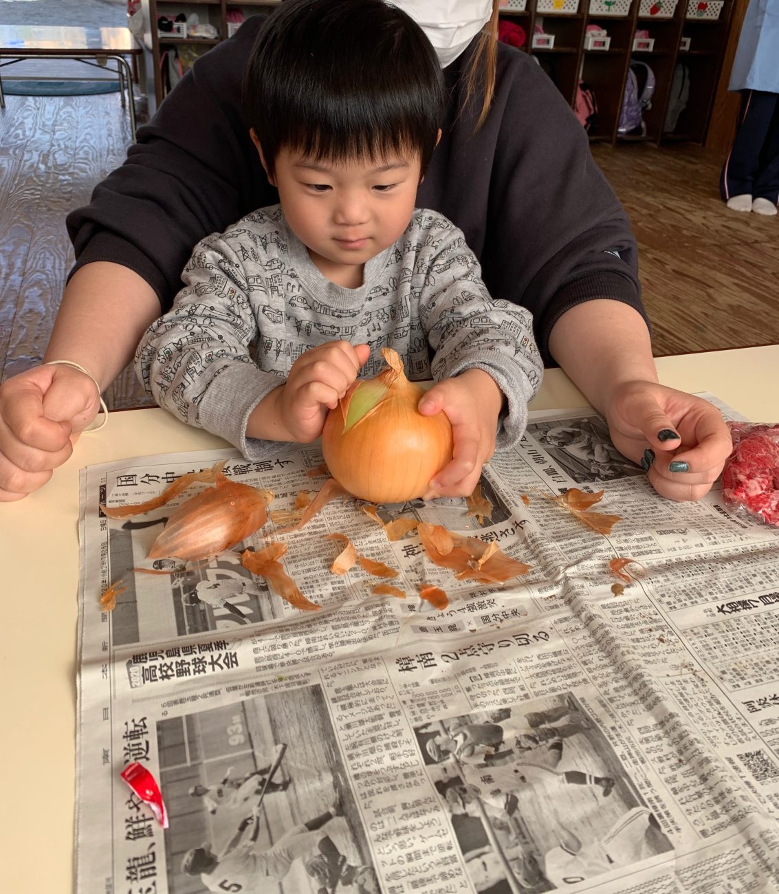 今回は、子どもたちから大人気の絵本『ぐるぐるカレー』と言う絵本からカレー作りをしました。
