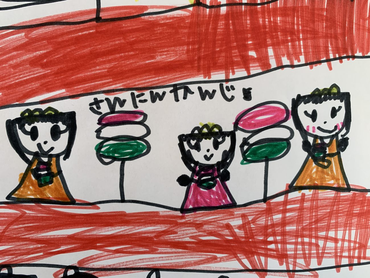 白紙にペンで描く子ども達。塗り絵遊びの影響でしょうか。まず、骨格を黒いペンで描き、その後に塗り絵のように色を塗って表現する子が多かったです。絵の描き方にも、今までのお絵描きや塗り絵の経験が生かされているのを感じました。