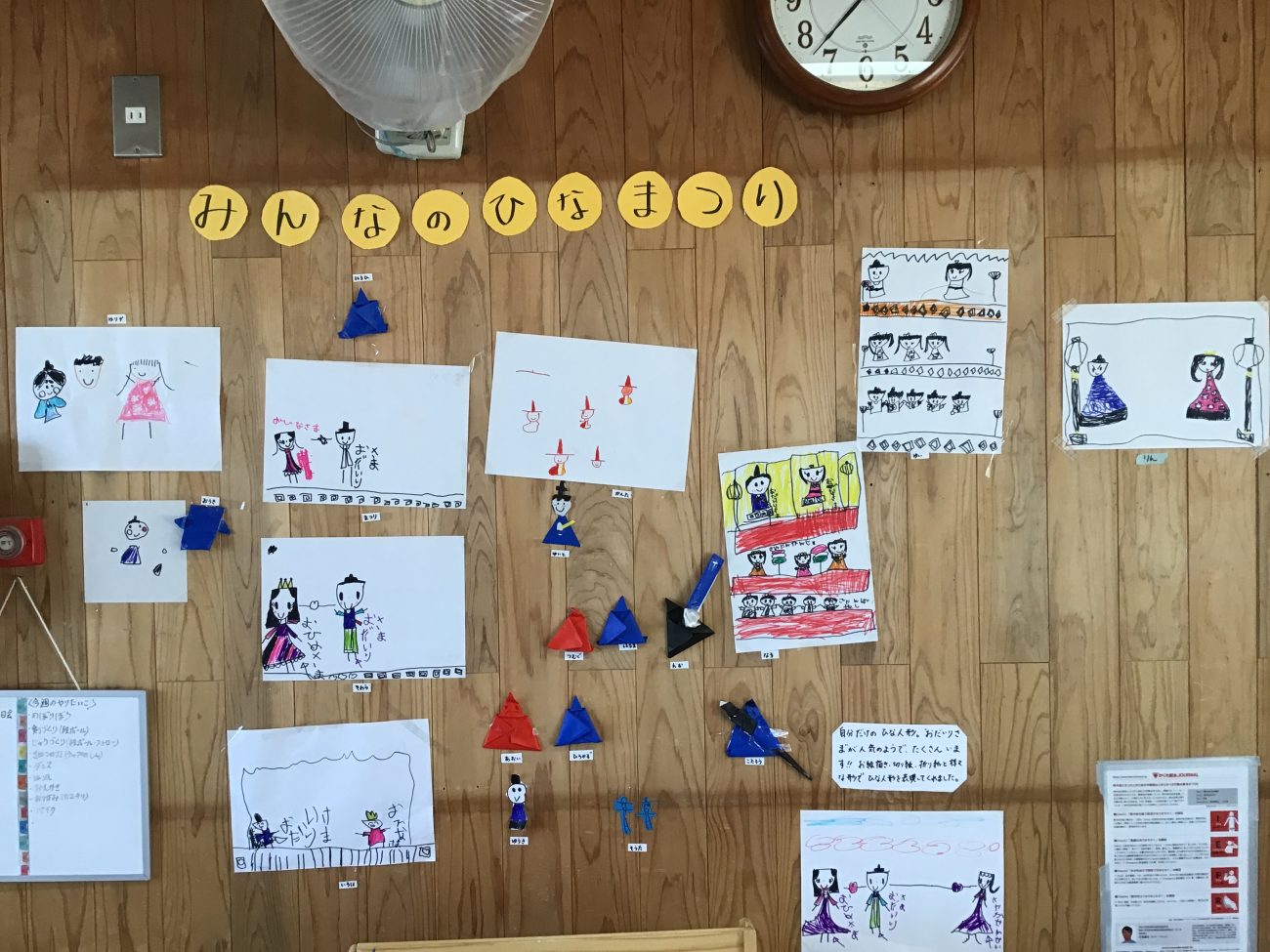男の子は折り紙で表現する子が多かったです。『雛人形、検索して下さい。』と言ってきたので、『検索?どうして?』と聞き返すと『折り方を知りたいから』と返ってきました。なるほど!と思いながらも、何でもかんでも“検索”ではなく、せっかく折り紙の本があるので調べて欲しいなぁ…という私の思いを優先し、本を数冊渡しました。すると、みんなで本を囲み折り方を調べ始めました。一つ一つの折り方の説明を読み取り理解し、みんなで確認しあう姿に、成長を感じました。なぜなら、私は絶対に『先生、ここどうやるの?』と、聞きにくる!だろうと思っていたからです。そんな風に思った自分が、子ども達に対して失礼だったなぁ…と反省でした。