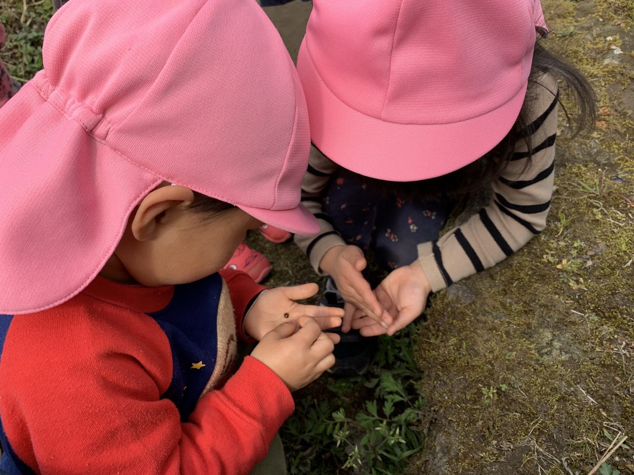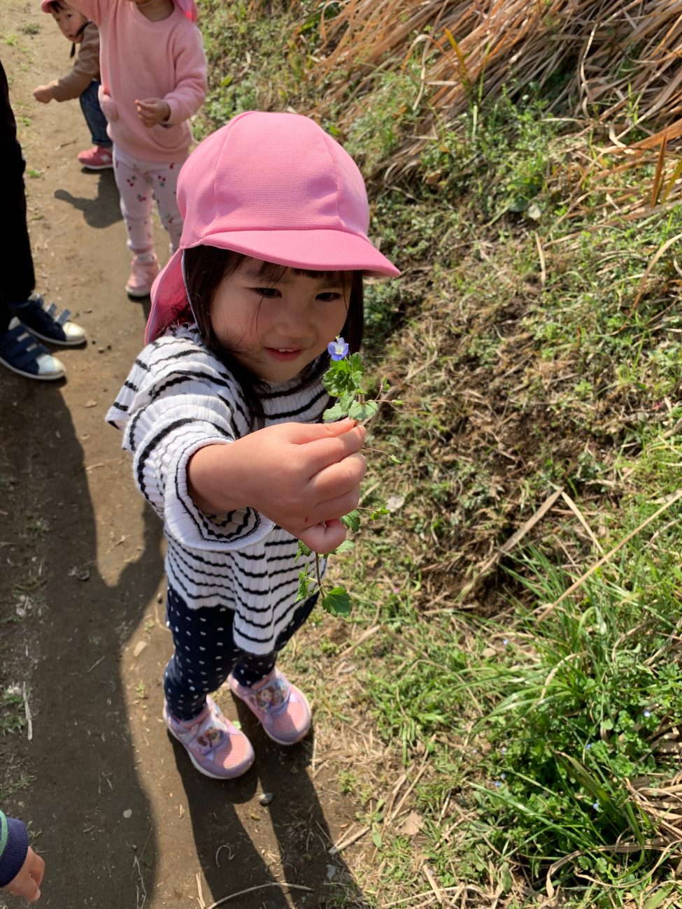 最近、暖かくなり保育園の桜が咲きました。ビオトープにはカエルの卵、おたまじゃくし、お散歩するとつくしやなずなの葉、ダンゴムシと春を感じさせるものがいっぱいです。