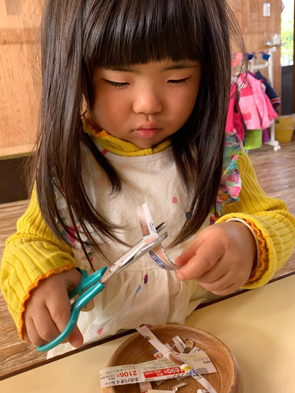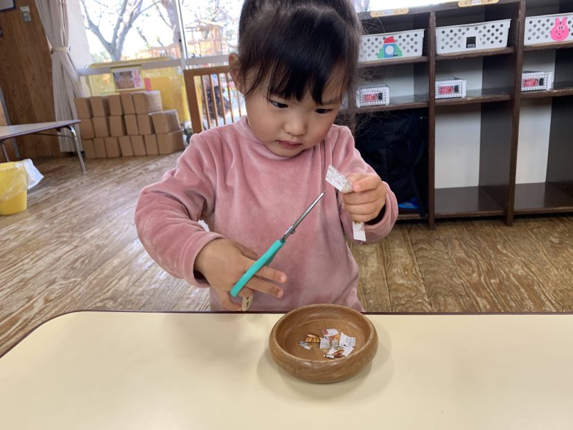 後日またハサミの活動を取り入れてみると、前回苦戦していた子がチョキチョキとハサミを動かしていて上手に切れていました。嬉しかったようで「まだ切る〜!」ととても集中していて、出来たことへの達成感にも繋がったのではと思いました。