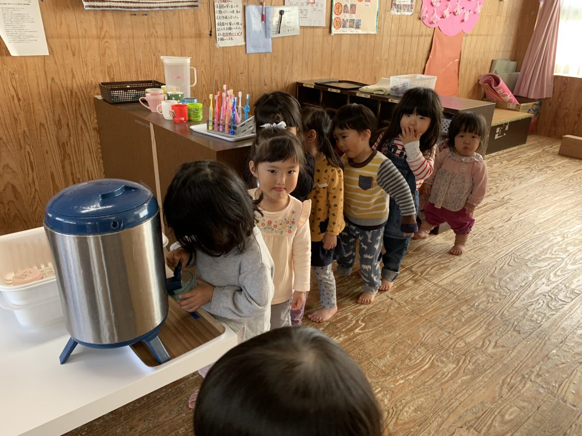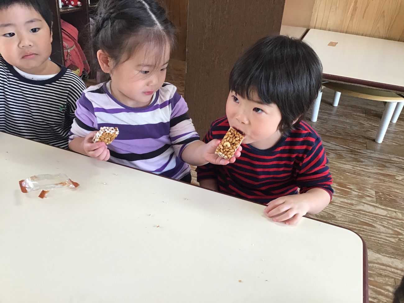 おやつの時間Mちゃんの横に積極的に座る子がいます。Mちゃんのことがとても大好きでいつも気にかけてくれる子です。Mちゃんがなかなかおやつやお茶を飲まない時、その子がそっとMちゃんの手元に持っていって持たせてくれることがあります。