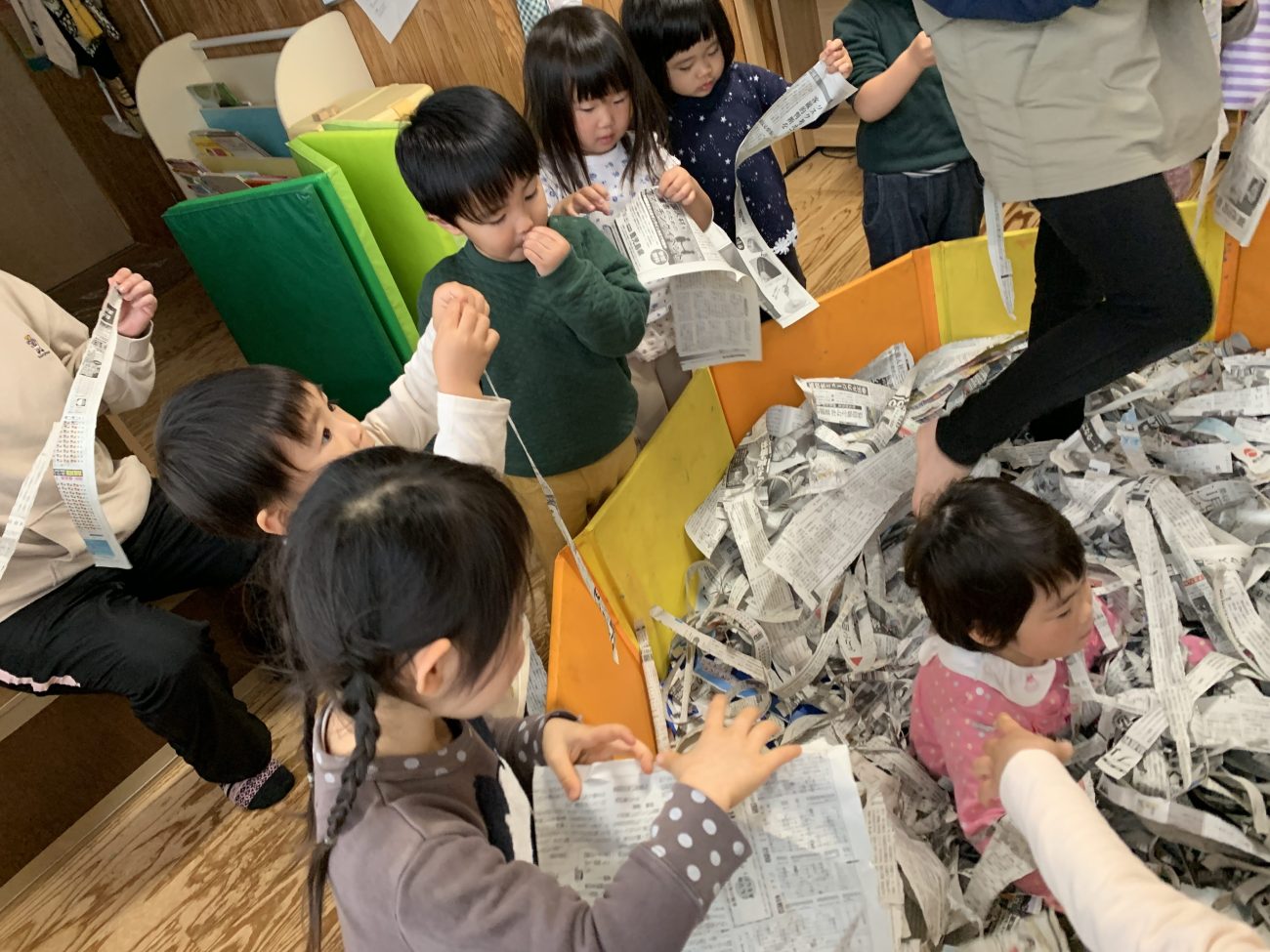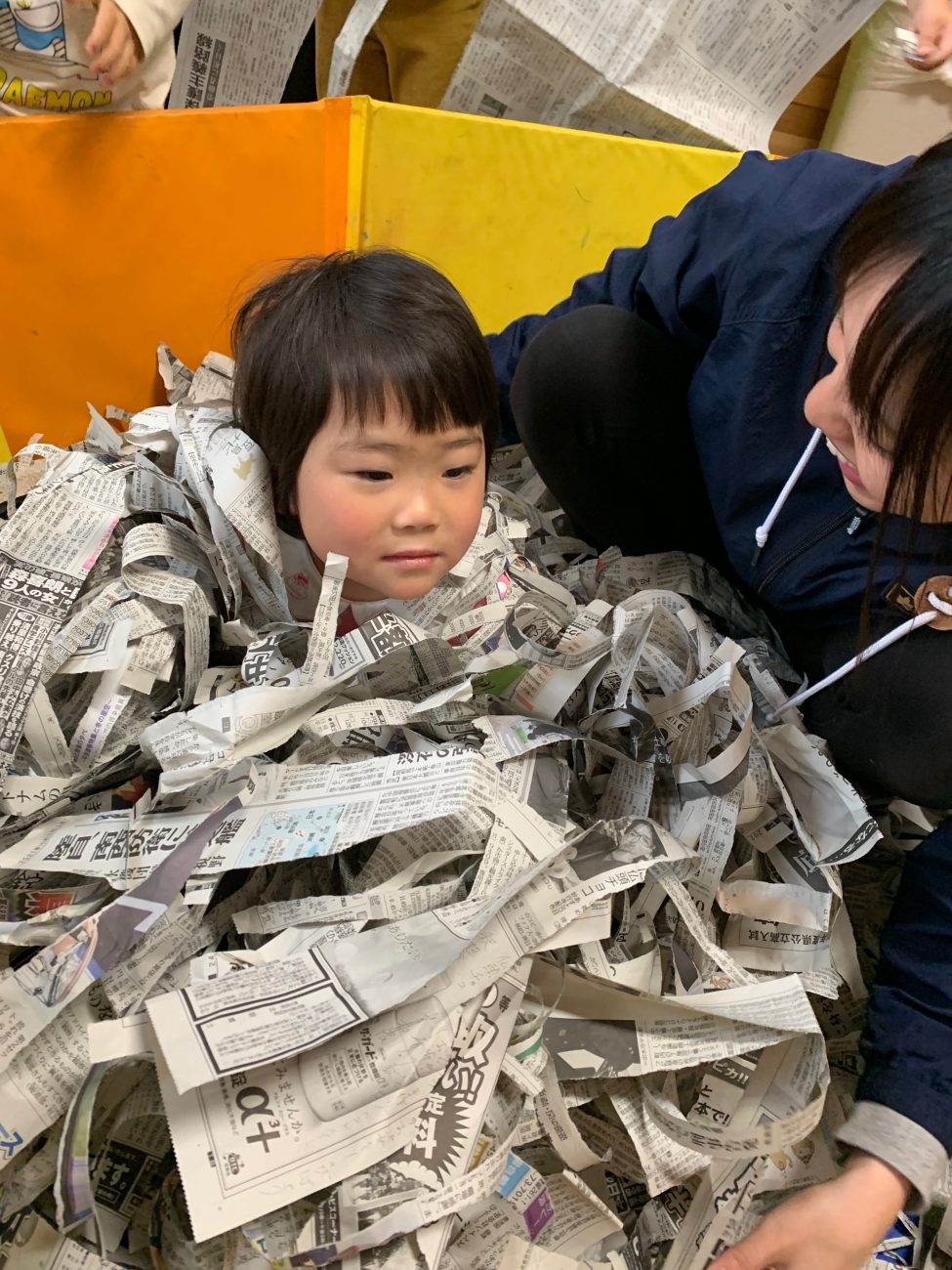 と言ってくれました。みんなでちぎって一生懸命完成させた新聞プール。誰もが先に入りたいと思っているだろうに「先に入っていいよ」の一言が出た事に驚きました。「ありがとう」と声をかけてMちゃんを中に入れると大喜び!!みんなも「よかったね〜!」「たのしい??」と嬉しそうでした。その後もみんなでちぎってMちゃんに「どーぞ!」と新聞紙をあげる姿がありました。