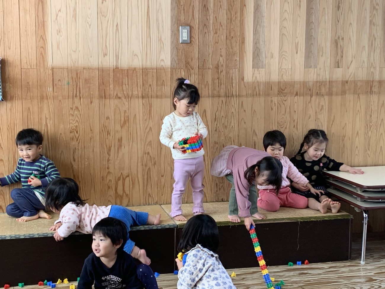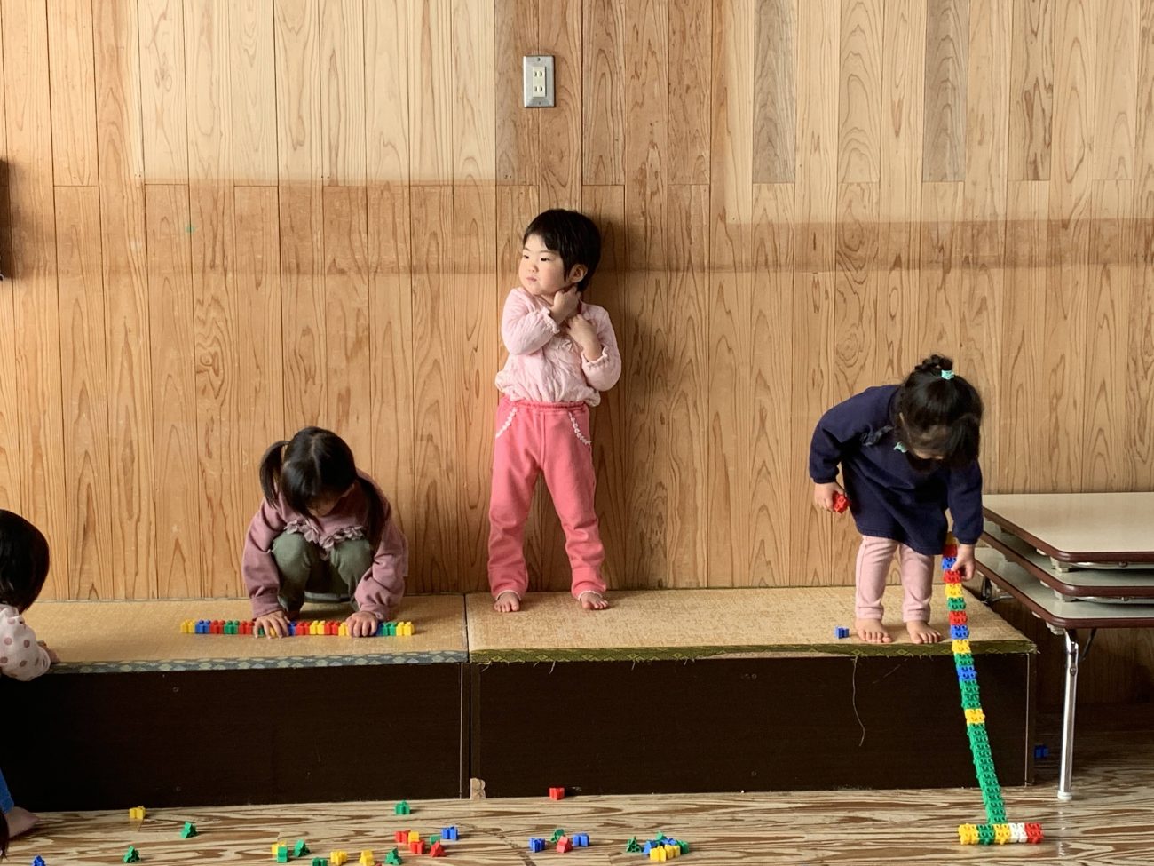 みんなが部屋の床で遊んでいる時、Mちゃんは1人で畳の上で遊んでいることが多いです。私たちも怪我がないように見守りつつ様子を見ていました。すると子どもたちがMちゃんに気づき、同じ空間で遊び始めました。遊びを強要するのではなく、ただ側にいることを楽しんでいます。さりげなくMちゃんの近くに寄り添い、そっと体をつけて一緒にいることを楽しんでいます。