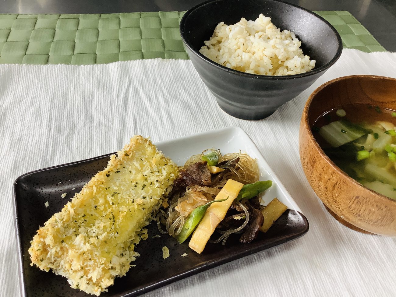 本日のメニューは、”厚揚げのカレーパン粉焼き””牛肉と春雨の炒め物””じゃがいもの味噌汁”でした。