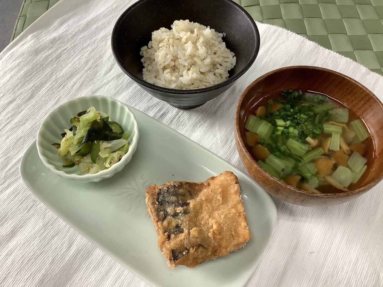 本日のメニューは、”魚の竜田揚げ””きゅうりの中華風和え””なめこの味噌汁”でした。