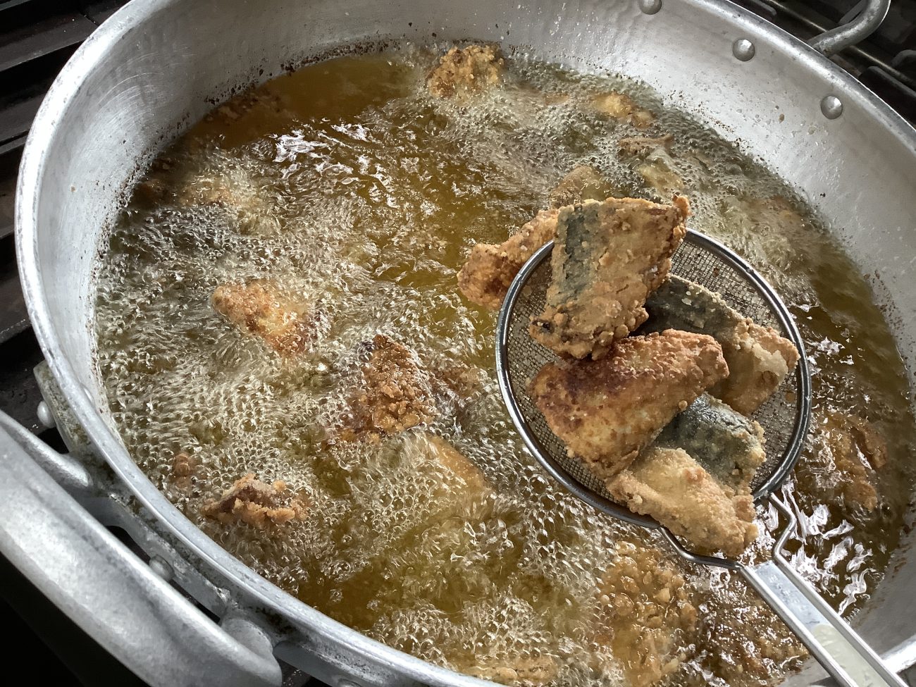 魚の竜田揚げは、脂ののった美味しい鯖が届きました。生姜・醤油・酒・みりん・キビトウに漬け込み、こめ油でカラリと揚げました。使用したこめ油は、国産米糠を使用しており、ビタミンEが含まれいるので、体に優しい油となっています。