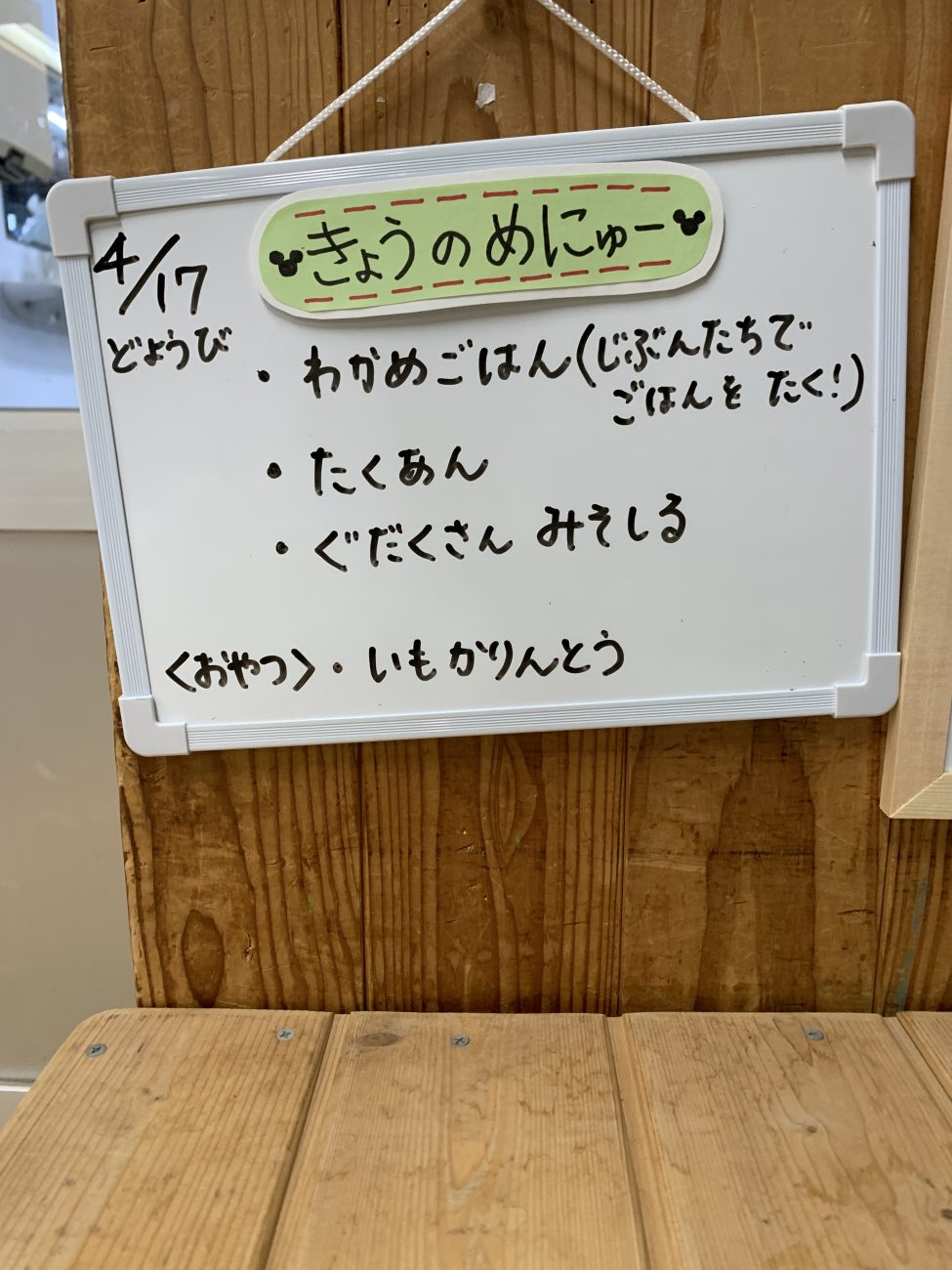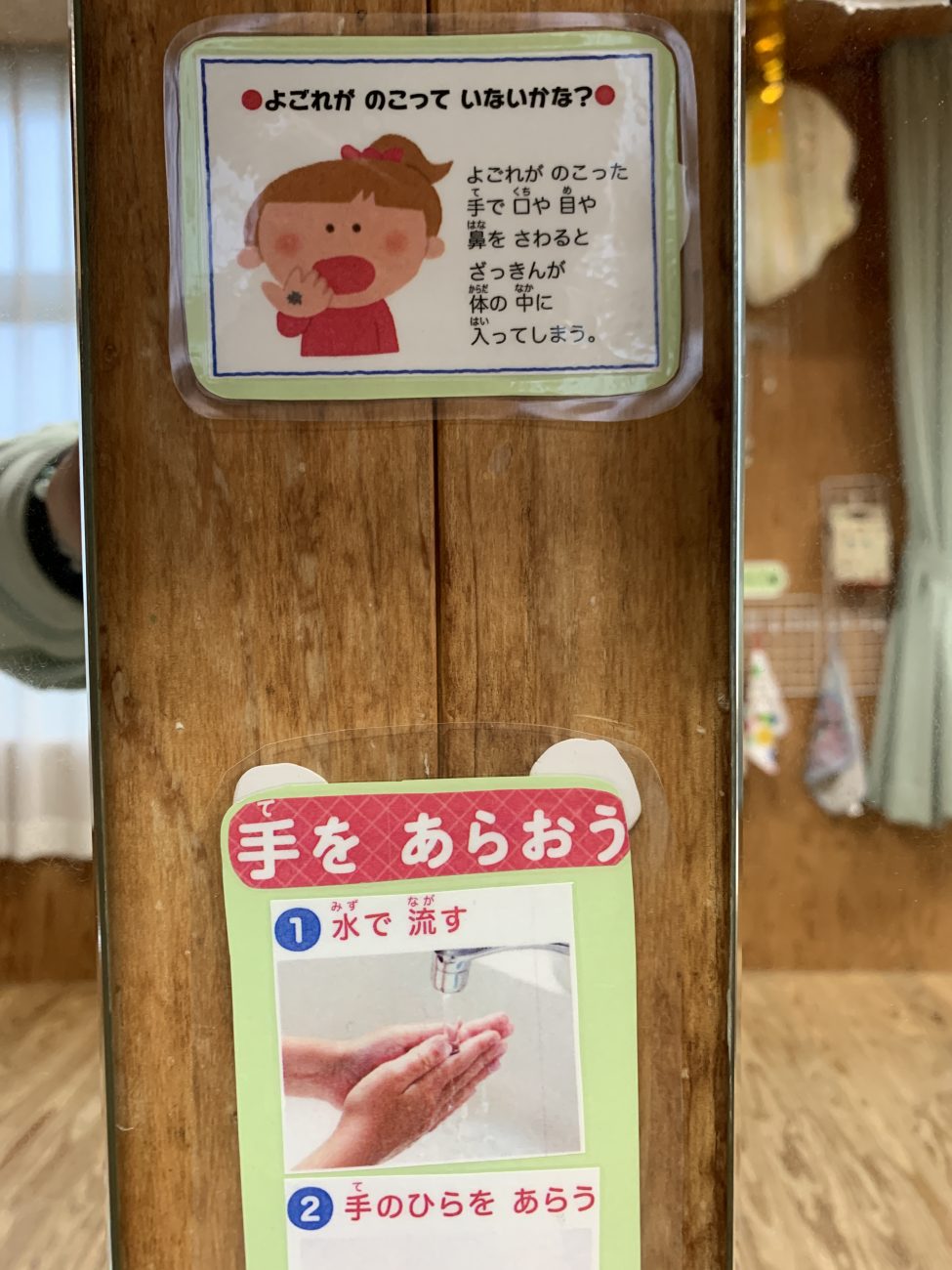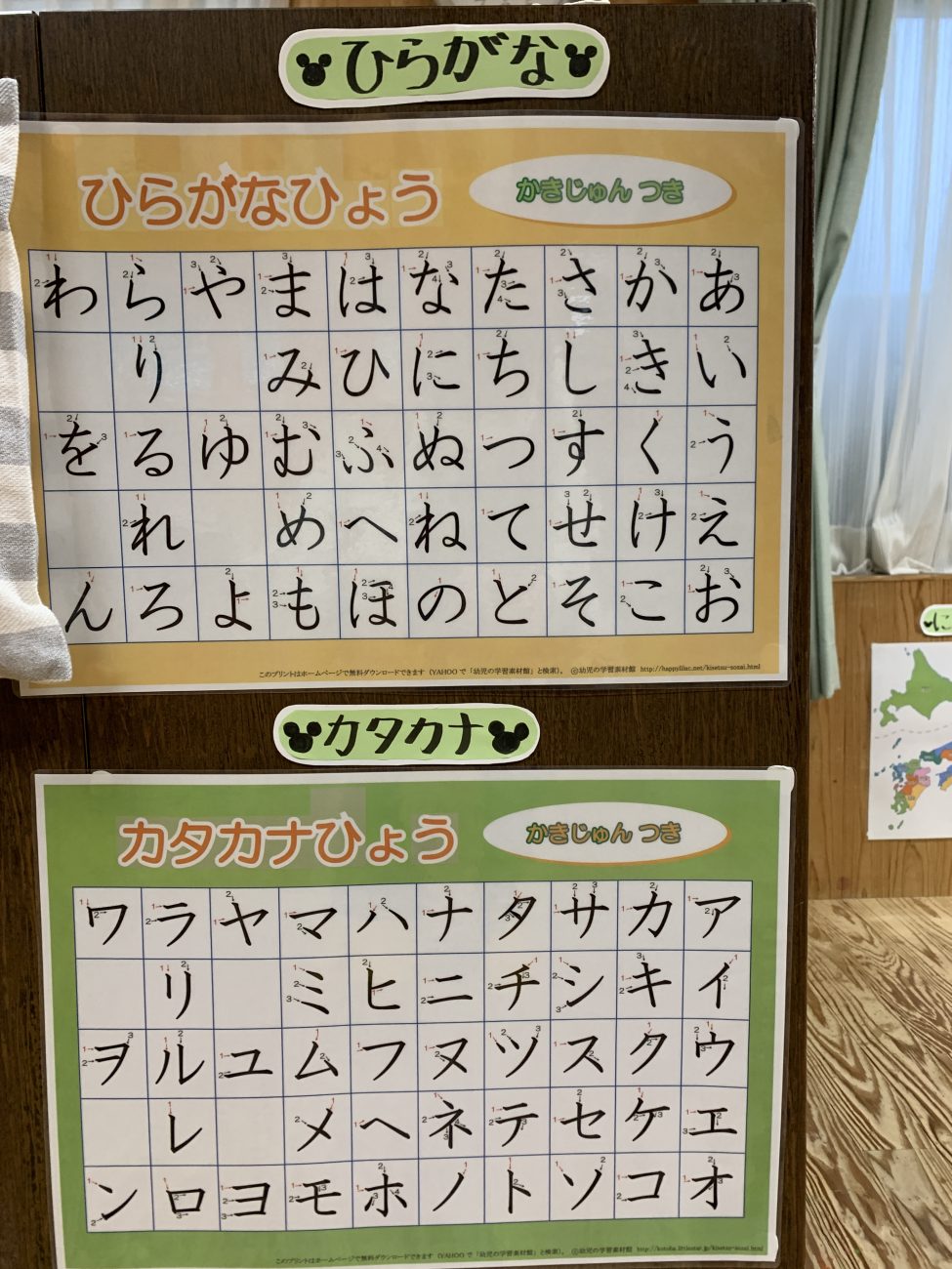 と、写真の様に保育室のありとあらゆる所に、平仮名を掲示。子ども達も自然と目に入るようで、ふとした時に文字の表記を声に出して読んでみたり、毎日の活動日程や給食メニューを子ども同士で読み合う姿もあり、私の中では『おっ!興味示してる。』と、ちょっぴりガッツポーズです。