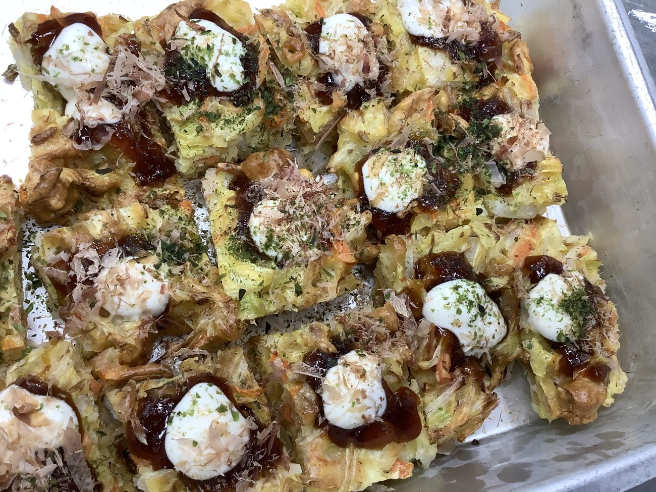 おやつは、野菜お好み焼きでした。人参やもやし、キャベツがたっぷりと入っています。また、桜海老も入っているので、桜海老のいい香りのするお好み焼きとなりました。