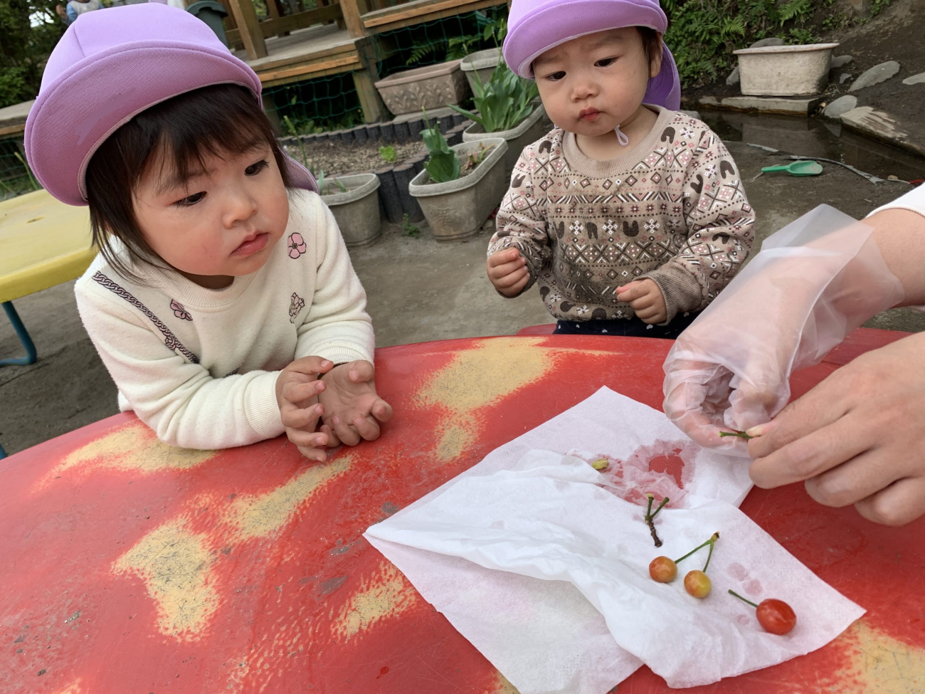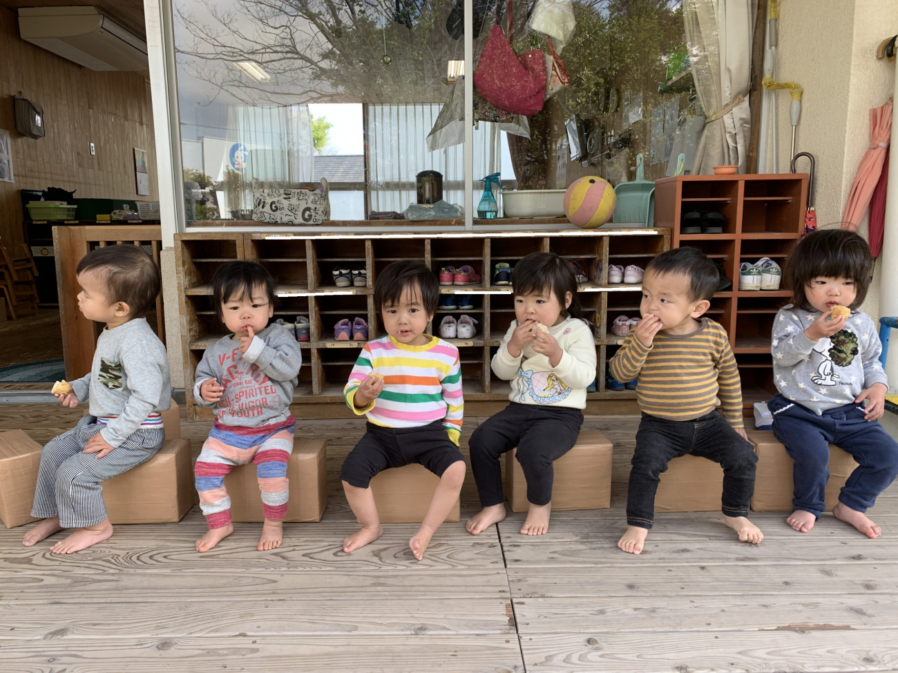 起きると外の太陽を浴びながらおやつを食べます。おかわり!と伝えてくれる子ども、ちょーだい!と手を合わせて教えてくれる子ども、意思表示が上手なうめ組さんです。
