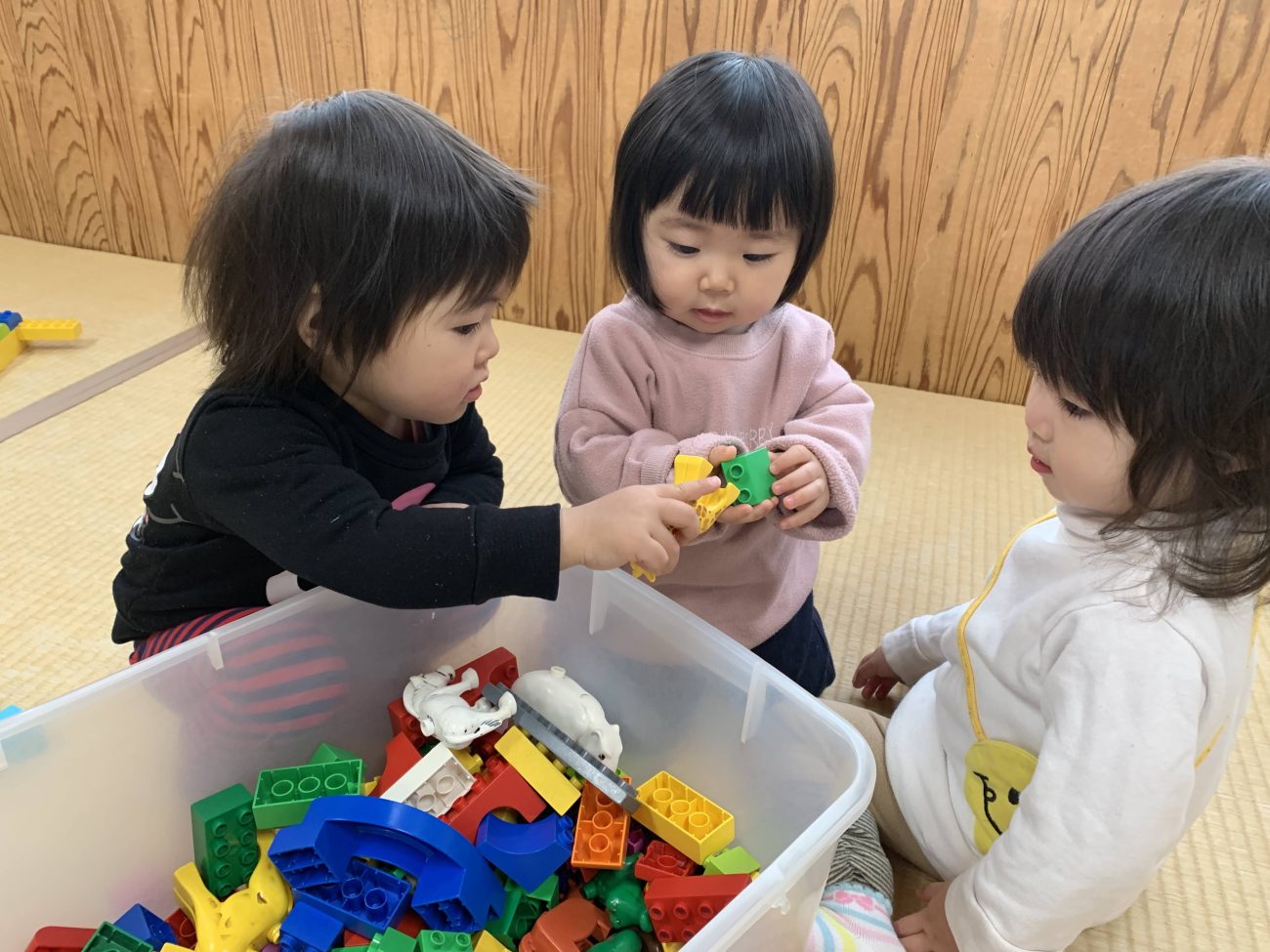8時まで様々な年齢の子どもたちと異年齢児交流もかねてうめ組で過ごします。大きいお兄ちゃんお姉ちゃんに戸惑うこともありますが、玩具をもらったり抱っこしてもらったりとお世話をしてくれる中、安心して過ごしています。