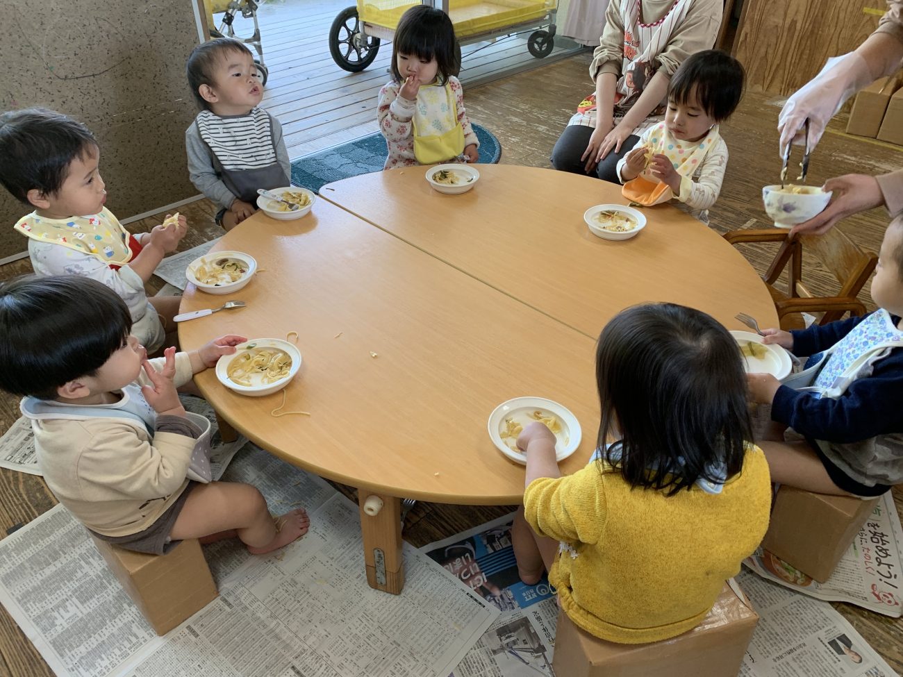 新しくうめ組に仲間入りした子ども達は、初めてのことに戸惑いながらも、給食をおかわりしてよく食べています、不安な気持ちから涙していると友達から頭を撫でてもらいながら少しずつ友達との距離も近づいてきて保育園生活に慣れてきている様子があります。