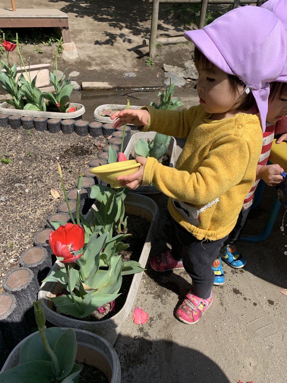 花を見つけたり、さくらんぼを見つけて食べてみたり、ビオトープの水の冷たさを感じたりと春の季節を感じながら園庭探索をしています。また、三輪車に乗ったり、ボールを蹴る・投げる、舞台で踊るなど園庭で伸び伸び体を動かしています。