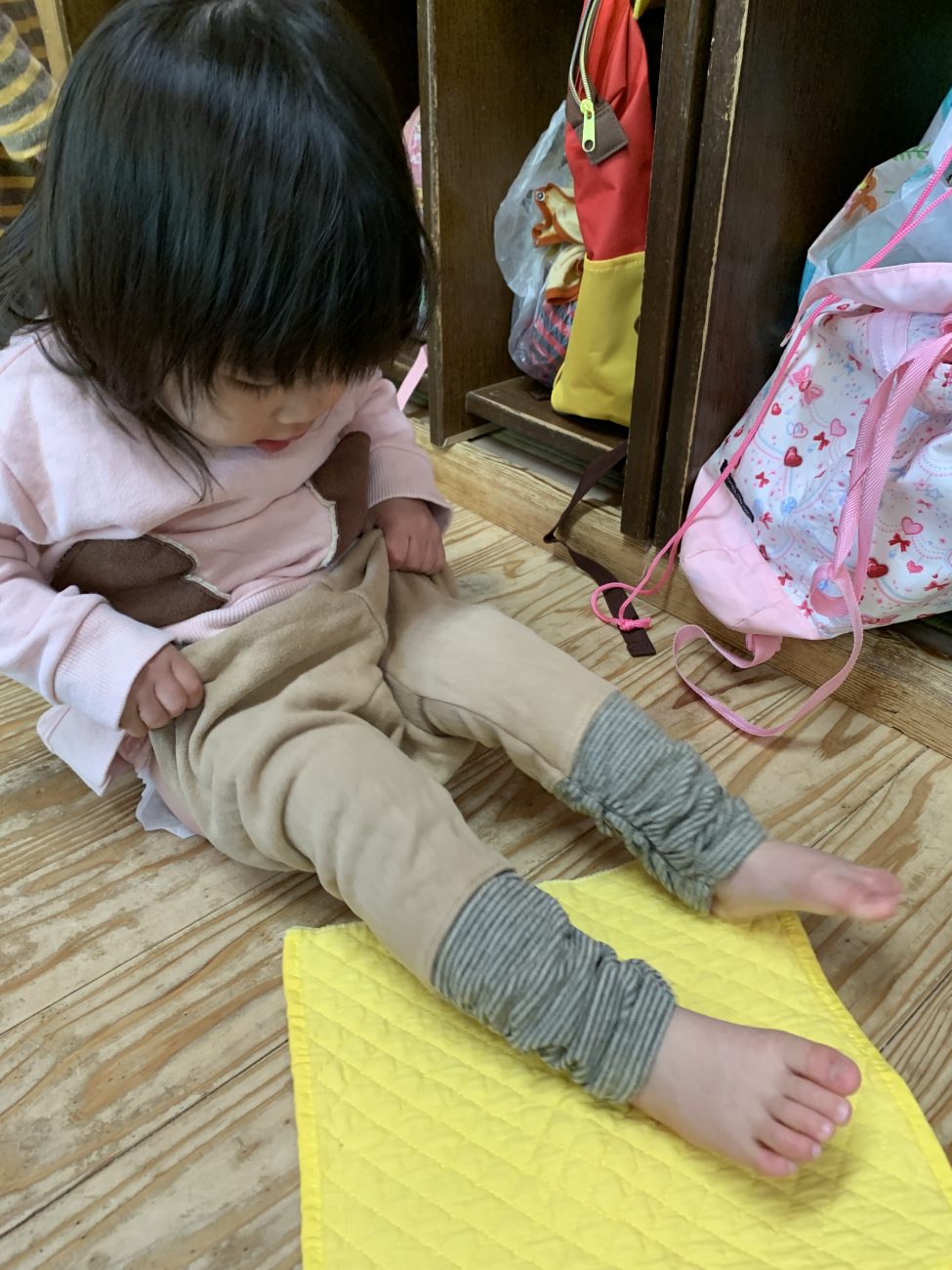 着替え終えると、枕を待って布団の敷いている場所まで向かいます。園での生活が身についているのだなと感じる瞬間でした。