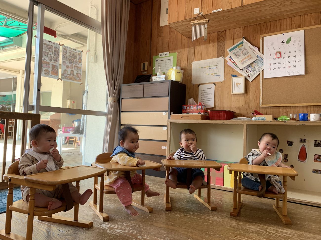 全員が揃ったら9時頃からおやつです。現在は月齢に合わせておやつを選んでいます。みんな、このおやつの時間が大好きで、テーブルを出すと一目散に近寄り、椅子に座りたい!とアピールをしてくれます。