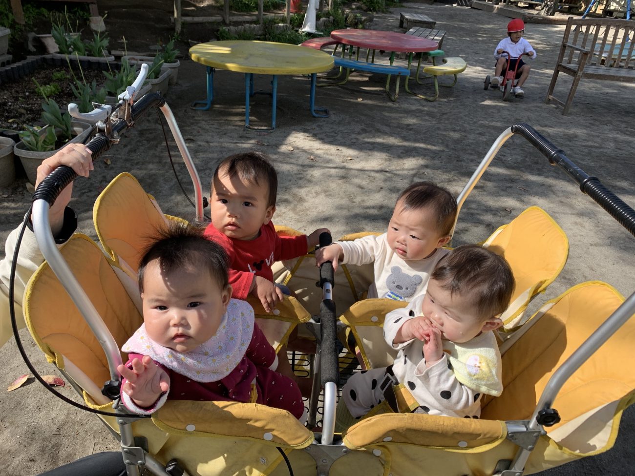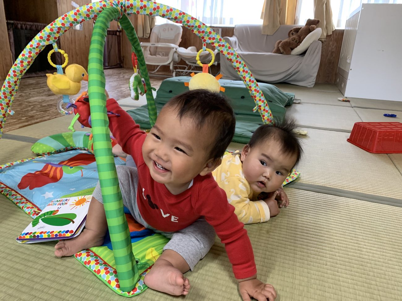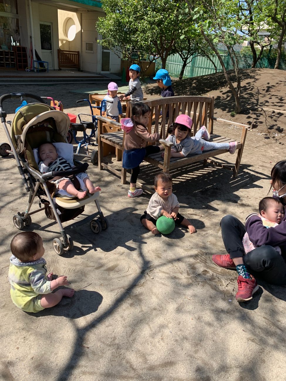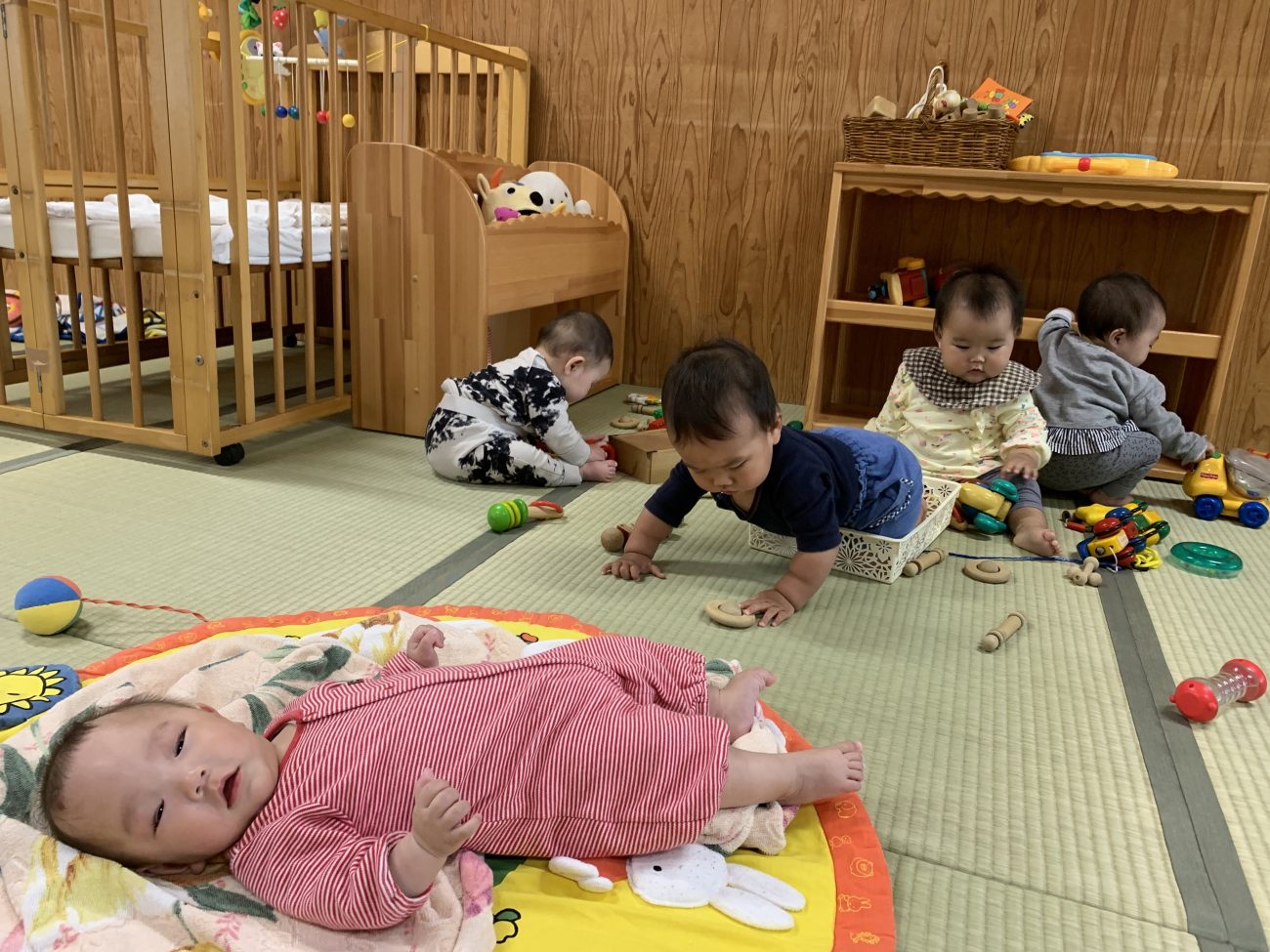おやつが終わったらその日の気候、体調に合わせて室内か戸外で遊びます。午前中眠たくなる事もあるので、一人ひとりに合わせて遊びを提供しています。