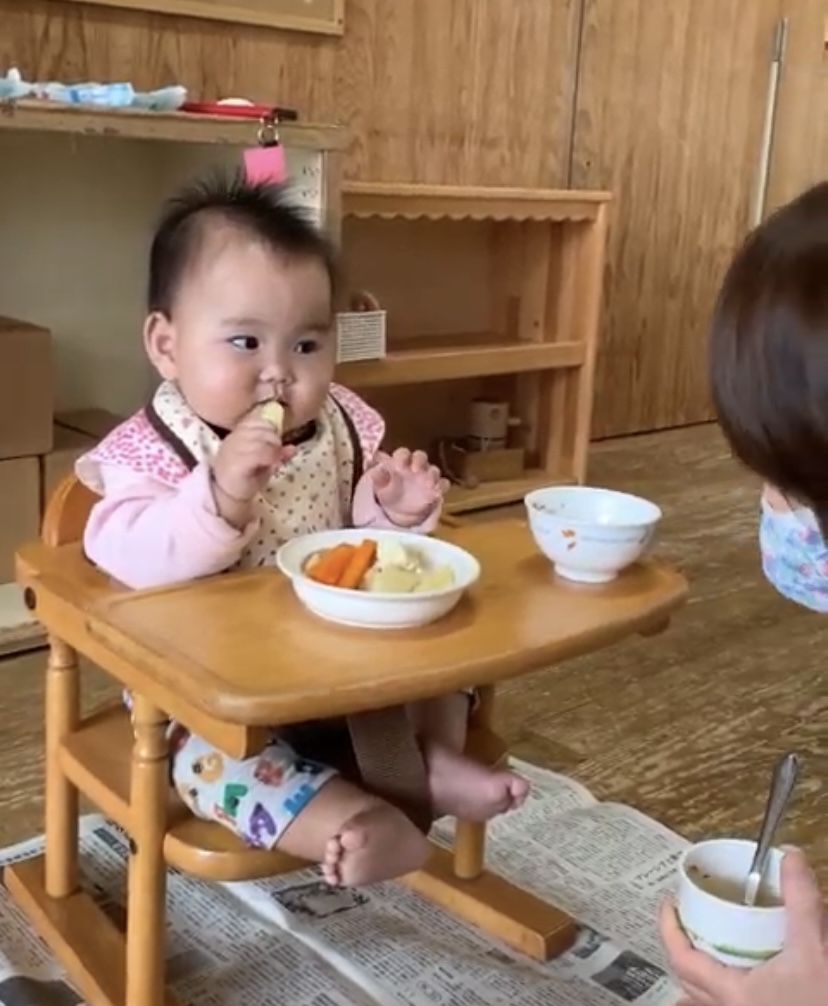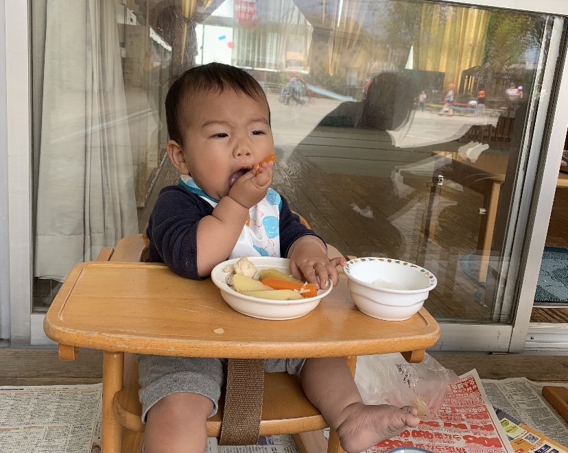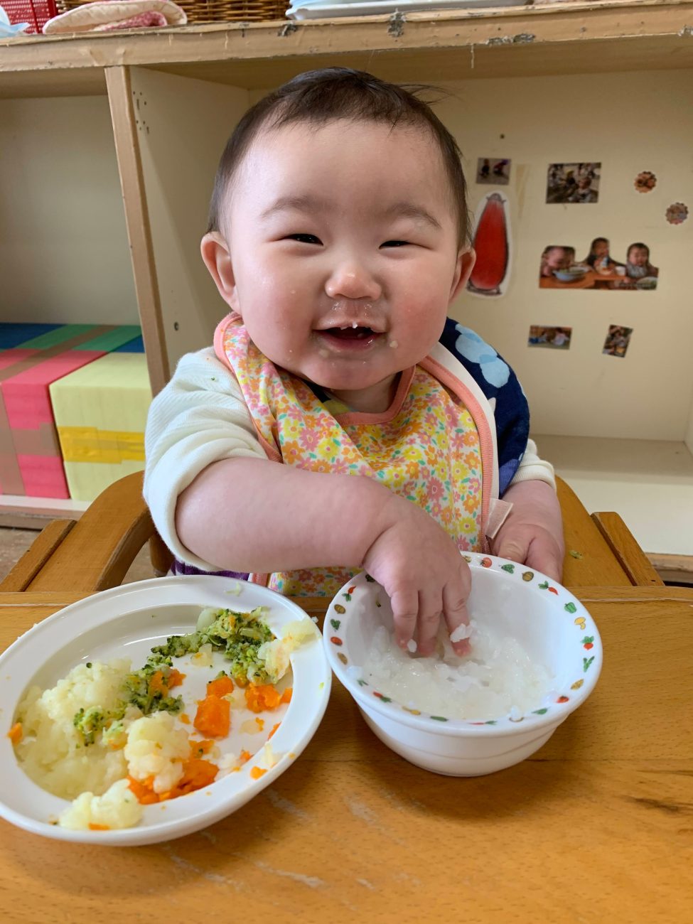 10時半頃から離乳食です。離乳食も一人ひとりに合わせて提供しています。ご家庭と担任、そして給食室と連携をとりながら離乳食を進めています。