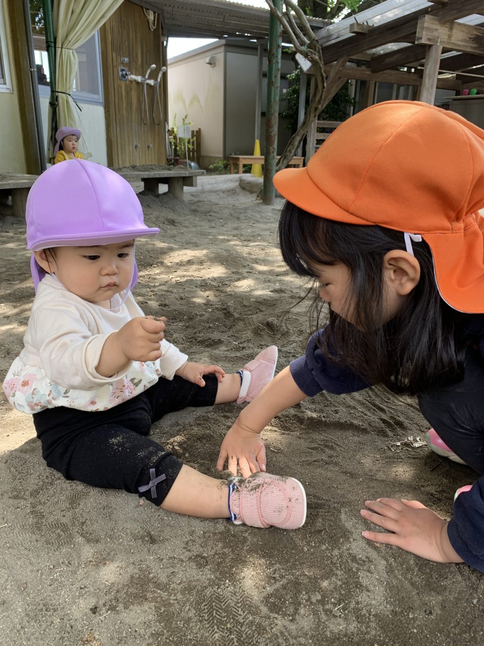 玩具を渡したり、頭を撫でたり顔を覗き込んだりして微笑みかけていました。きっと、日々の異年齢交流を通して、お兄ちゃんお姉ちゃんから自分も同じ様にしてもらって安心出来たり嬉しかったりしたことだったのかなと思います。