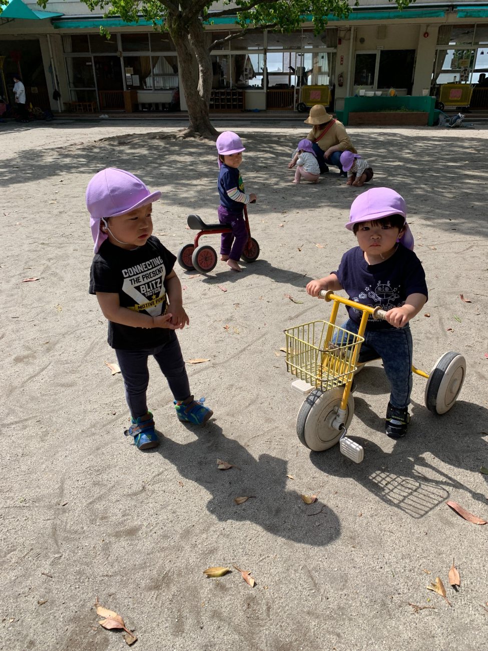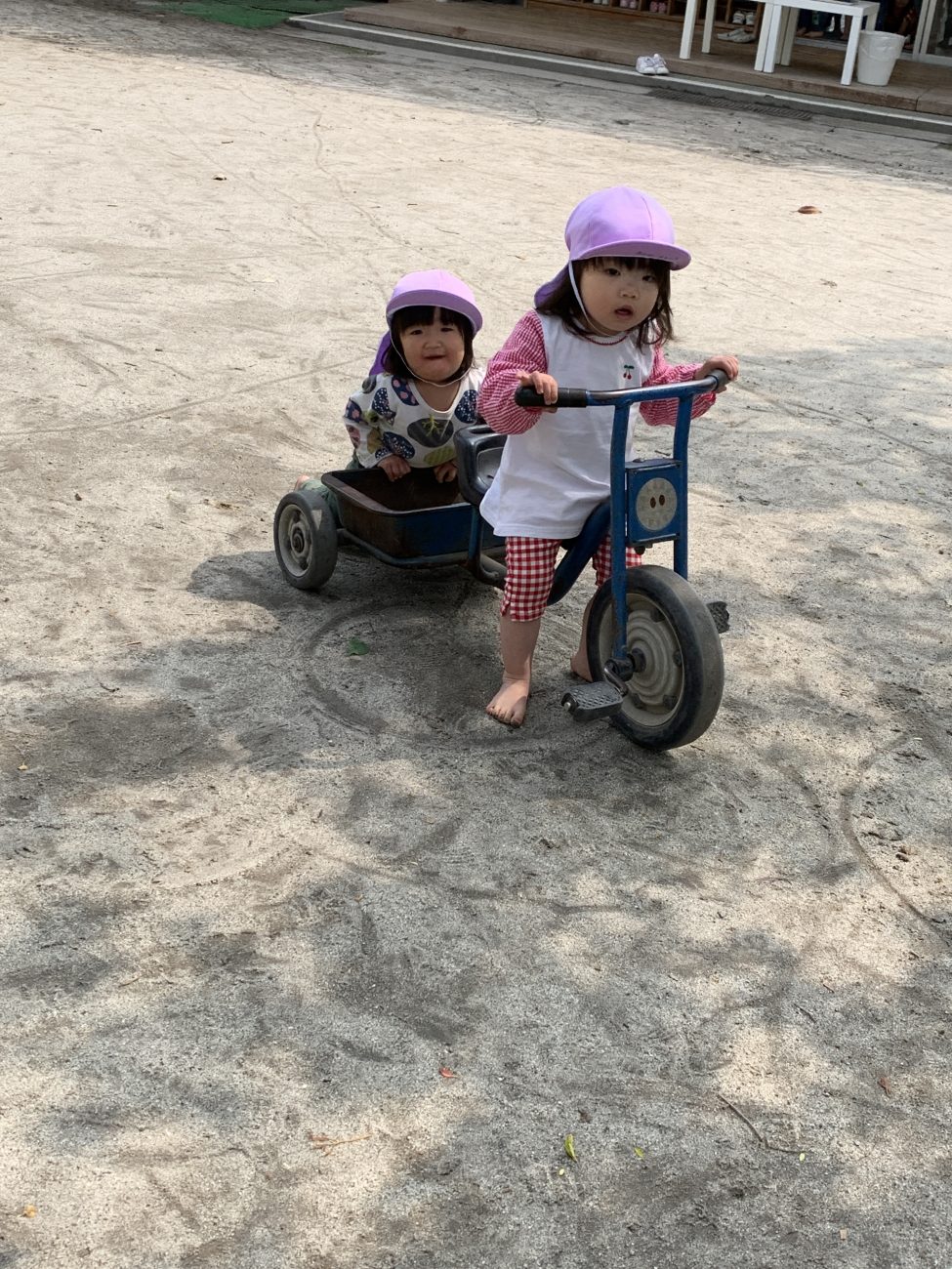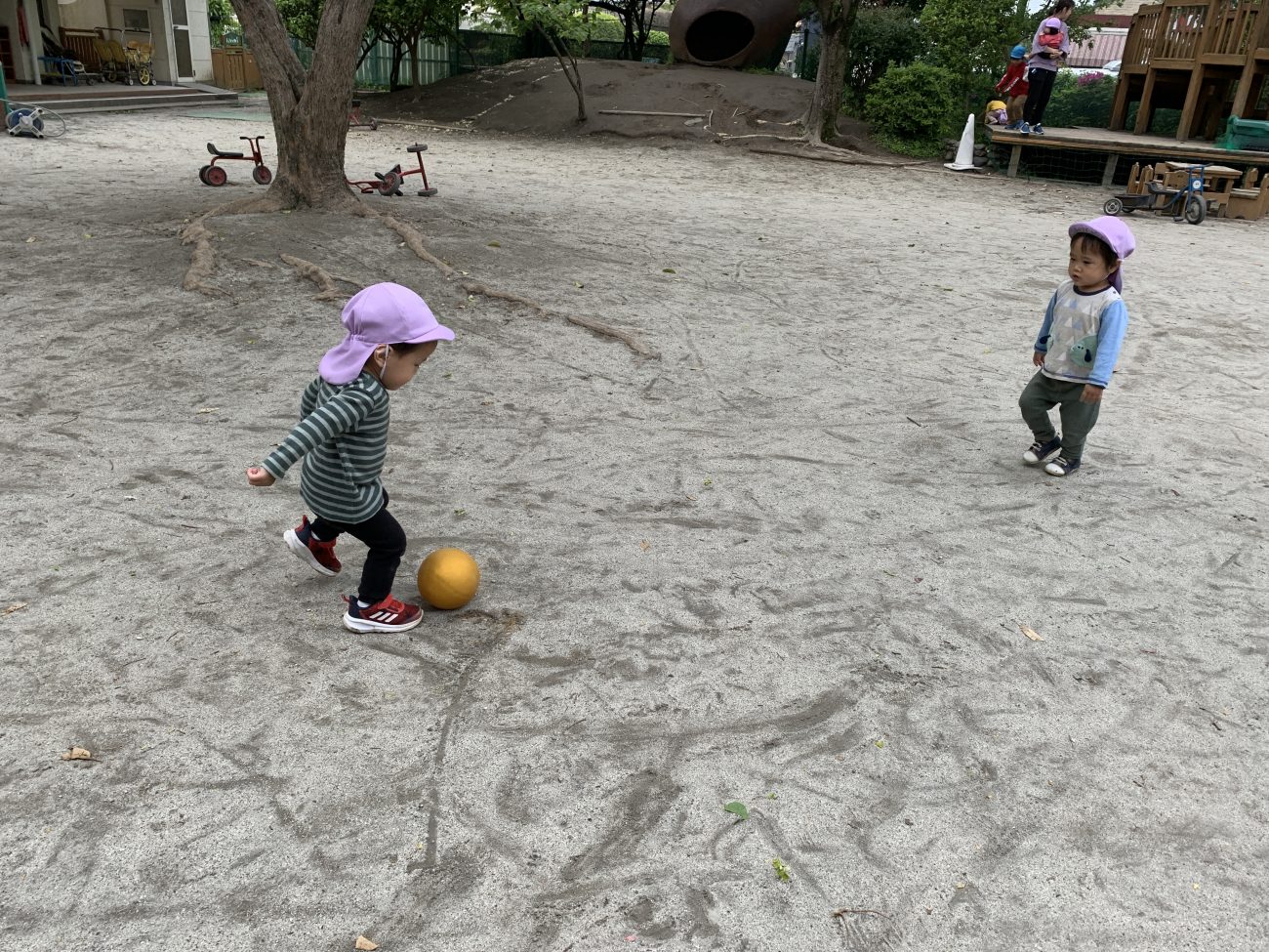 たんぽぽ組(0歳児)から進級した子どもたちは、友達のことを意識して行動する姿をよく見かけます。うめ組の友達が三輪車に乗っていると後ろに乗ったり、後ろから押してあげたり、ボールを蹴っていると友達も近くに寄り一緒にボールでパスをする姿も見られ、友達と一緒にを意識して遊ぶようになってきました。