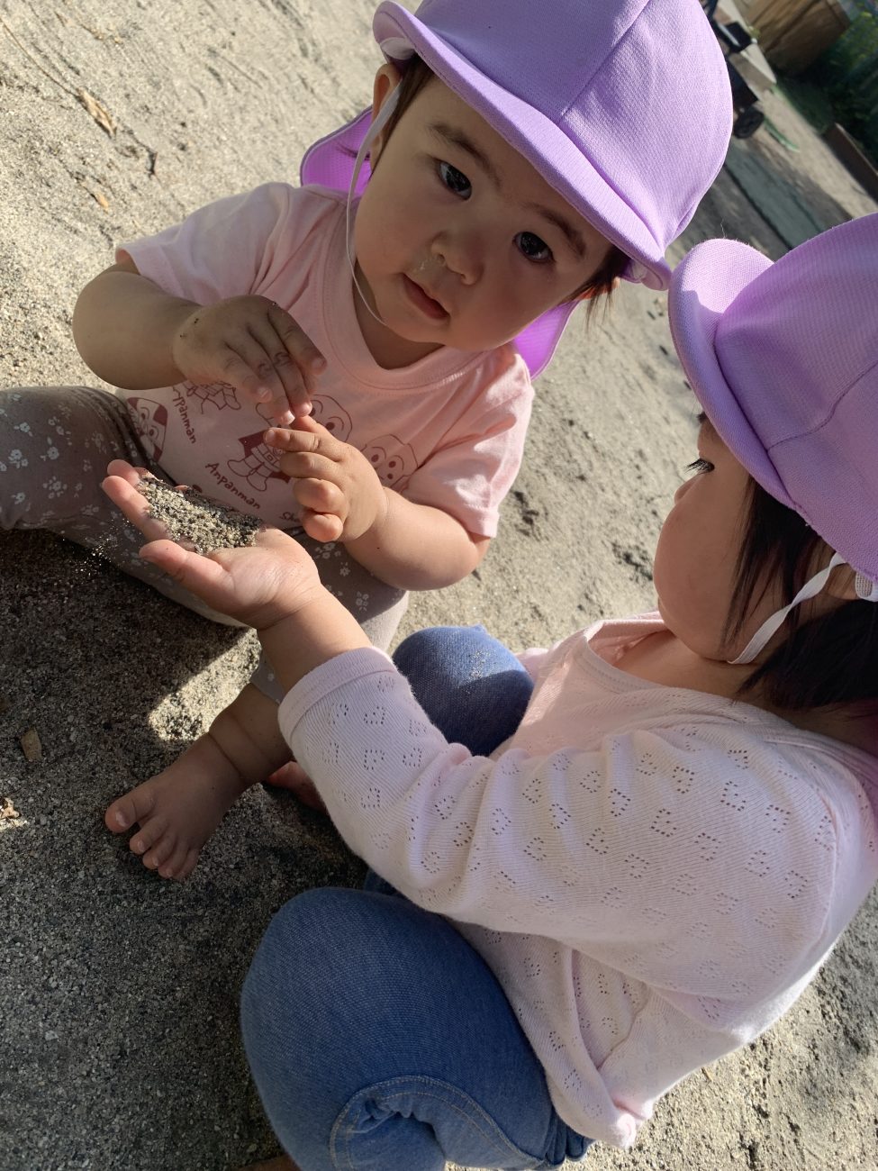 また、新入園児の友達の名前と顔も覚え、指をさし名前を呼んでくれます。頭をヨシヨシしたり、顔を覗き込んで微笑んだりしてくれることで、不安だった園生活で涙していた子どもたちが笑顔を見せてくれるようになりました。新入園児の子どもたちも、うめ組の友達の顔を認識し指をさしたり、時折子ども同士でお話をすることが増えてきました。安心できる場所へと変わってきたことに私たちも嬉しく思います。