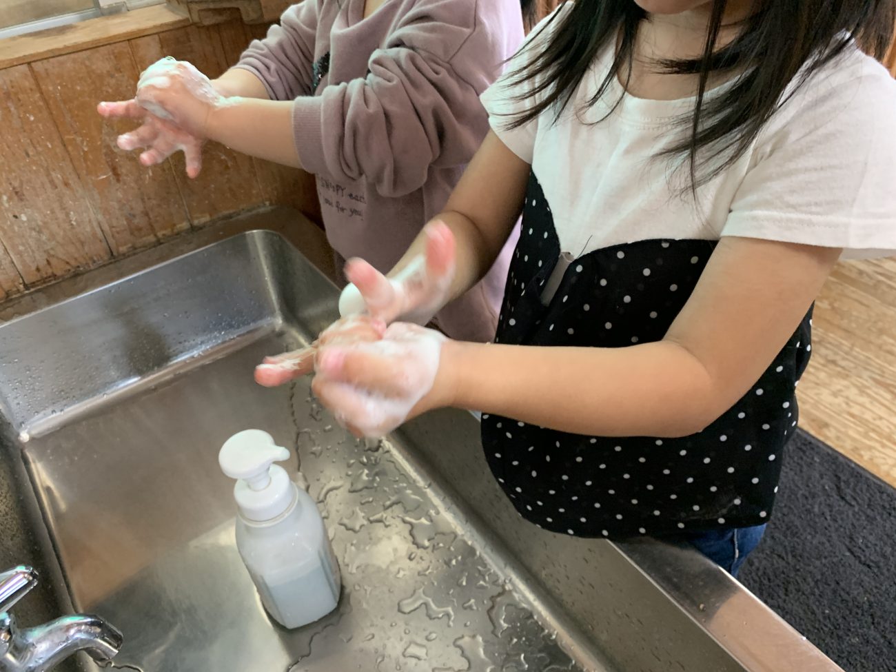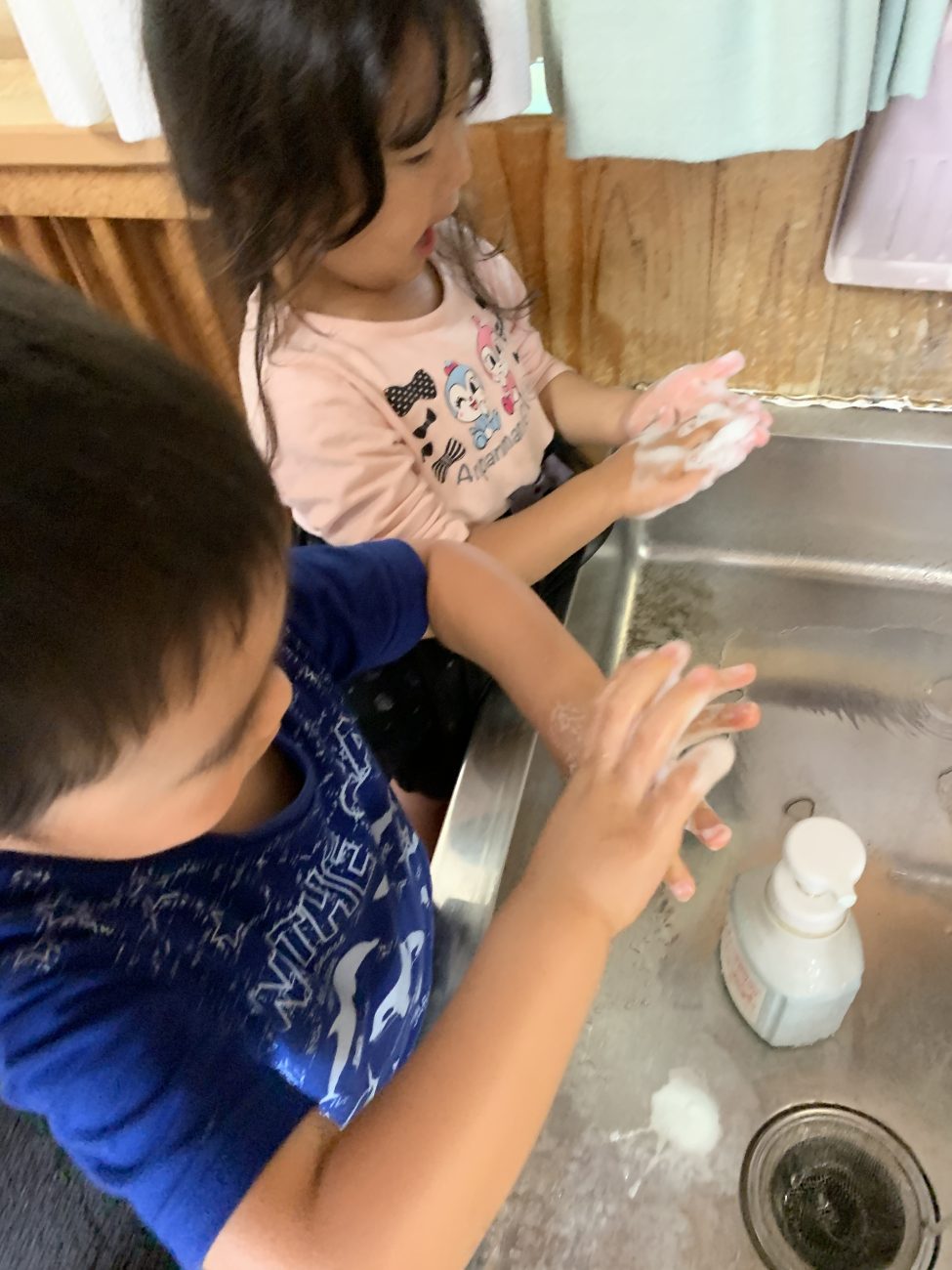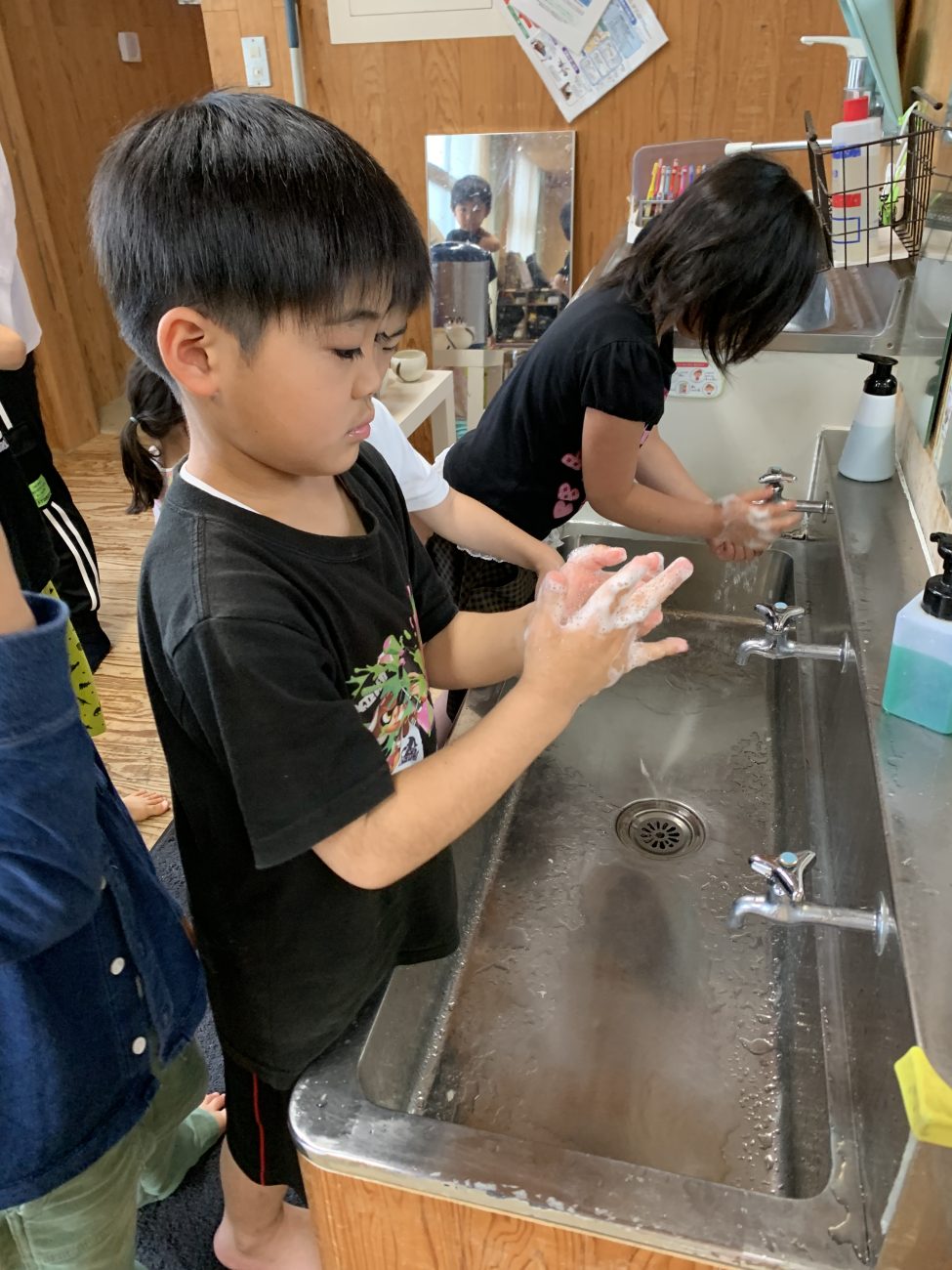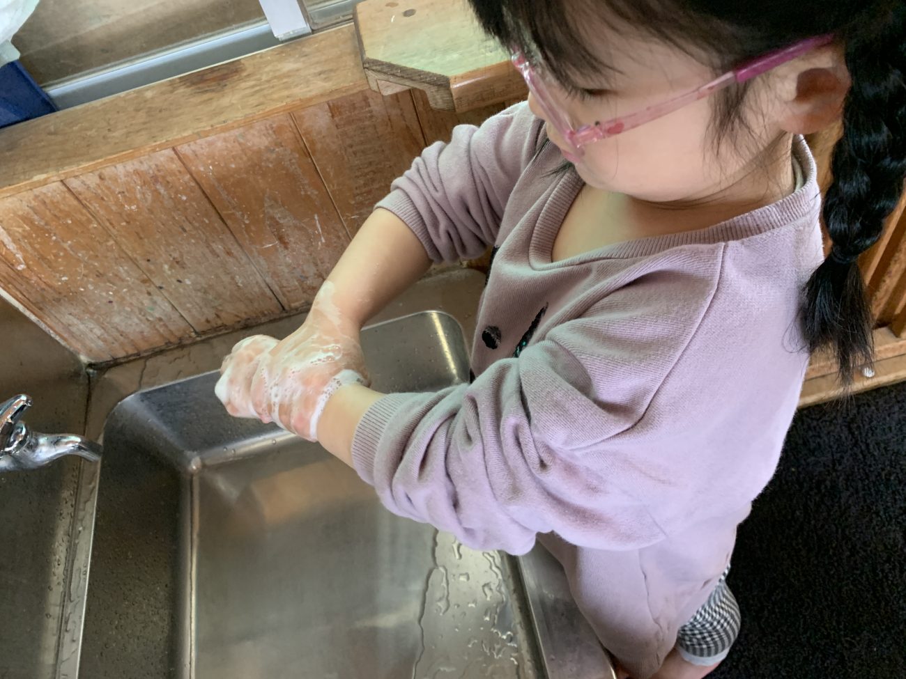 年齢的に、手を洗うことは身についてきてはいますが、「何故、手を洗わないといけないのか」等 理由が結びつくことが難しい為、現在きく組の保育士はその都度子ども達に手を洗うことの大切さを分かりやすく伝える工夫をしています。今後も、年齢が上がるにつれて手の洗い方が上達していくと思いますが、感染症が流行る時期など更に徹底していきたいと思います。