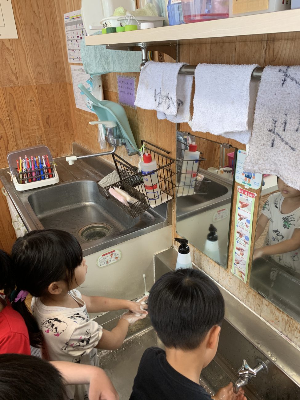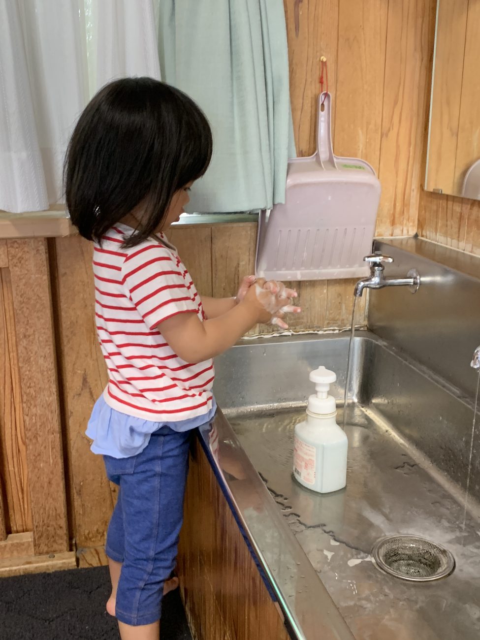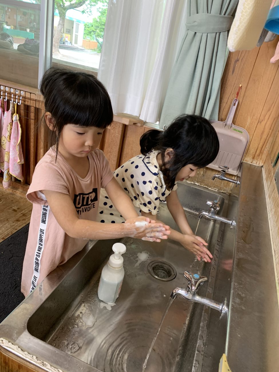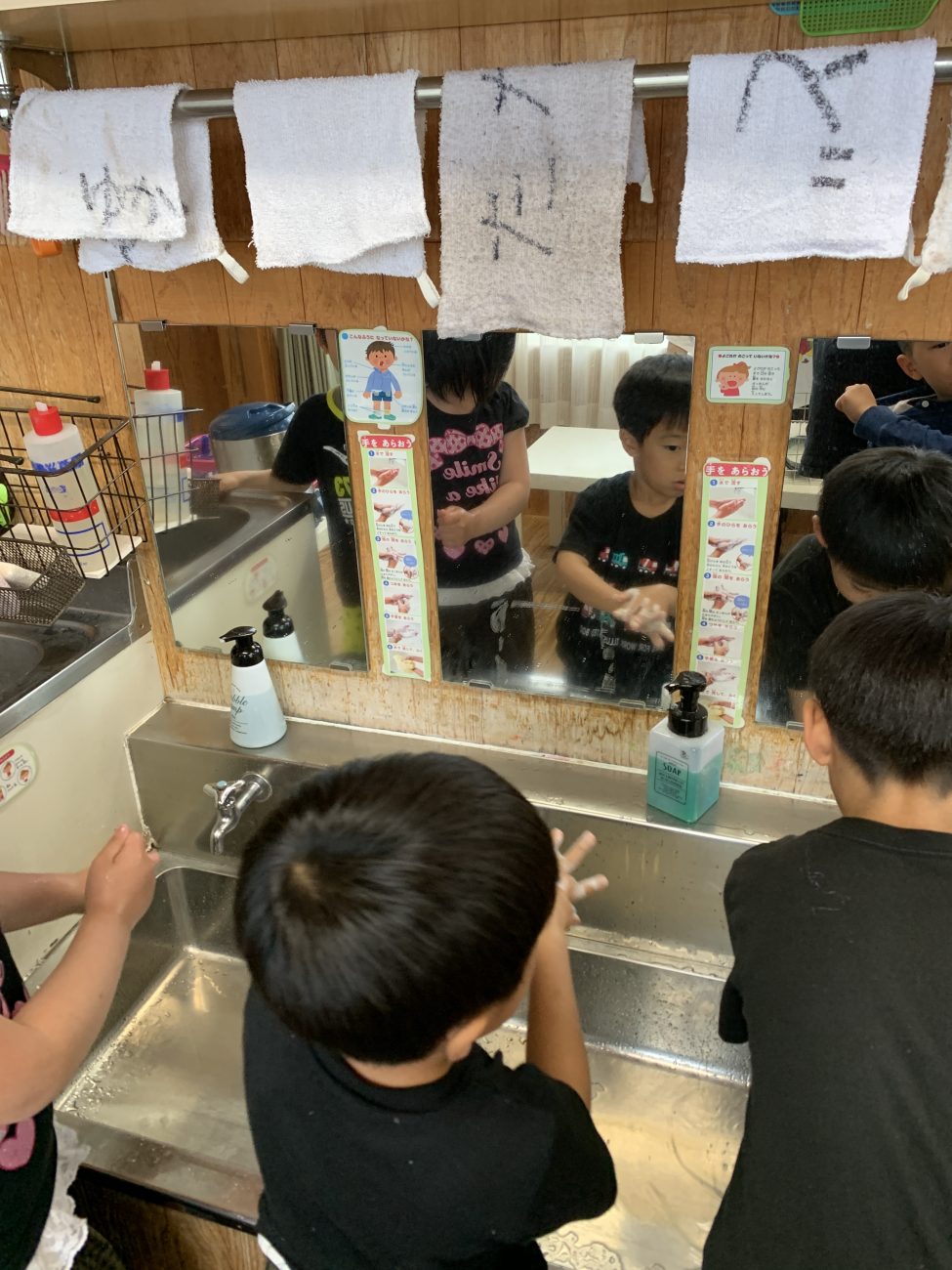 現在、3歳以上児は年齢に合わせた手洗い指導の方法を取り入れています。