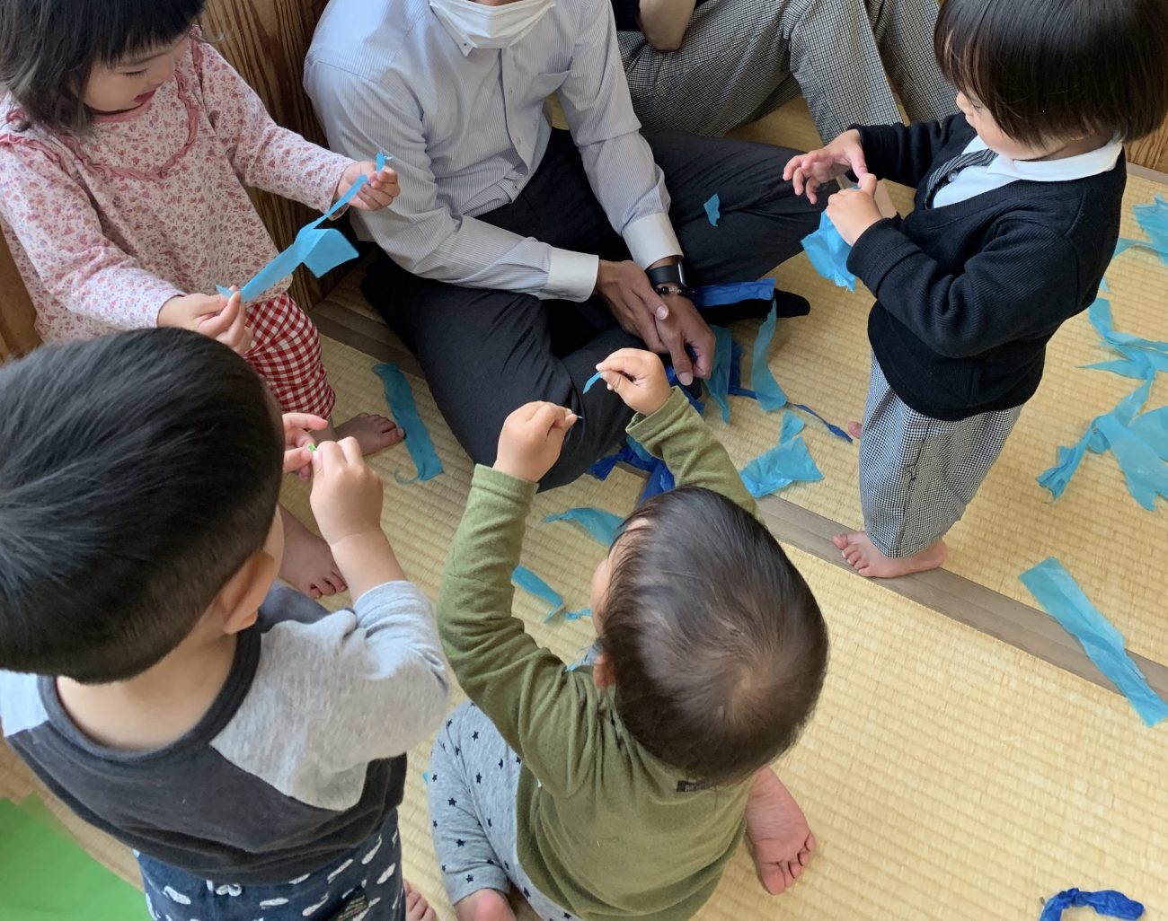 おやつの時間の後は、当日の天候が雨だったこともあり、花紙やボールを使った室内遊びをしました。園での遊びを保護者の方と一緒に過ごすいつもと違った特別な時間に、うめ組の子どもたちは保護者の方の膝に座りに行ったり千切った花紙やボールを持って行ったりと、沢山遊んでいただき嬉しそうな様子が見られました。