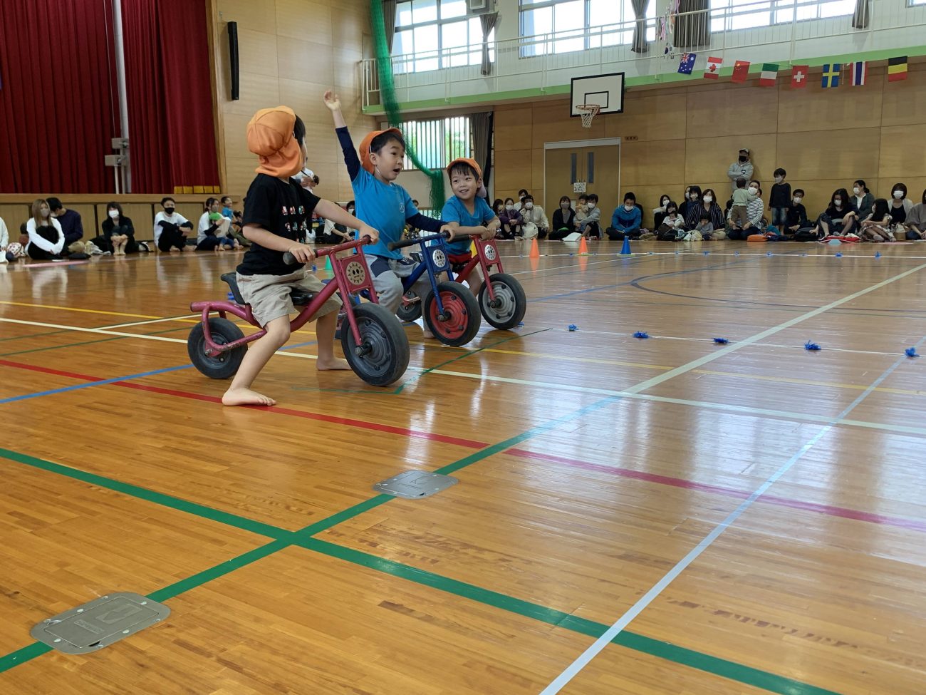 同列1位というリレーの結果に、大喜びする子ども達。練習では勝ったり負けたりを繰り返し、本番も勝敗の予想ができず、子ども達もドキドキでした。これまで順番を変えたり、お互いのチームの秒数を図ったりと、大人のアドバイスを受けながら試行錯誤してきました。