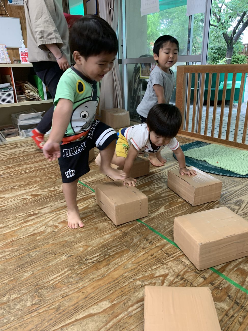 サーキットと呼ぶこともある活動ですが、円状でぐるぐる回るわけではありません。組み合わせたいくつかの遊具を周回して体を動かす遊びです。月に4回保育園に来て頂いている、作業療法士中鶴先生のアドバイスを受けた活動です。「アダプテーション」とも呼んでいます。