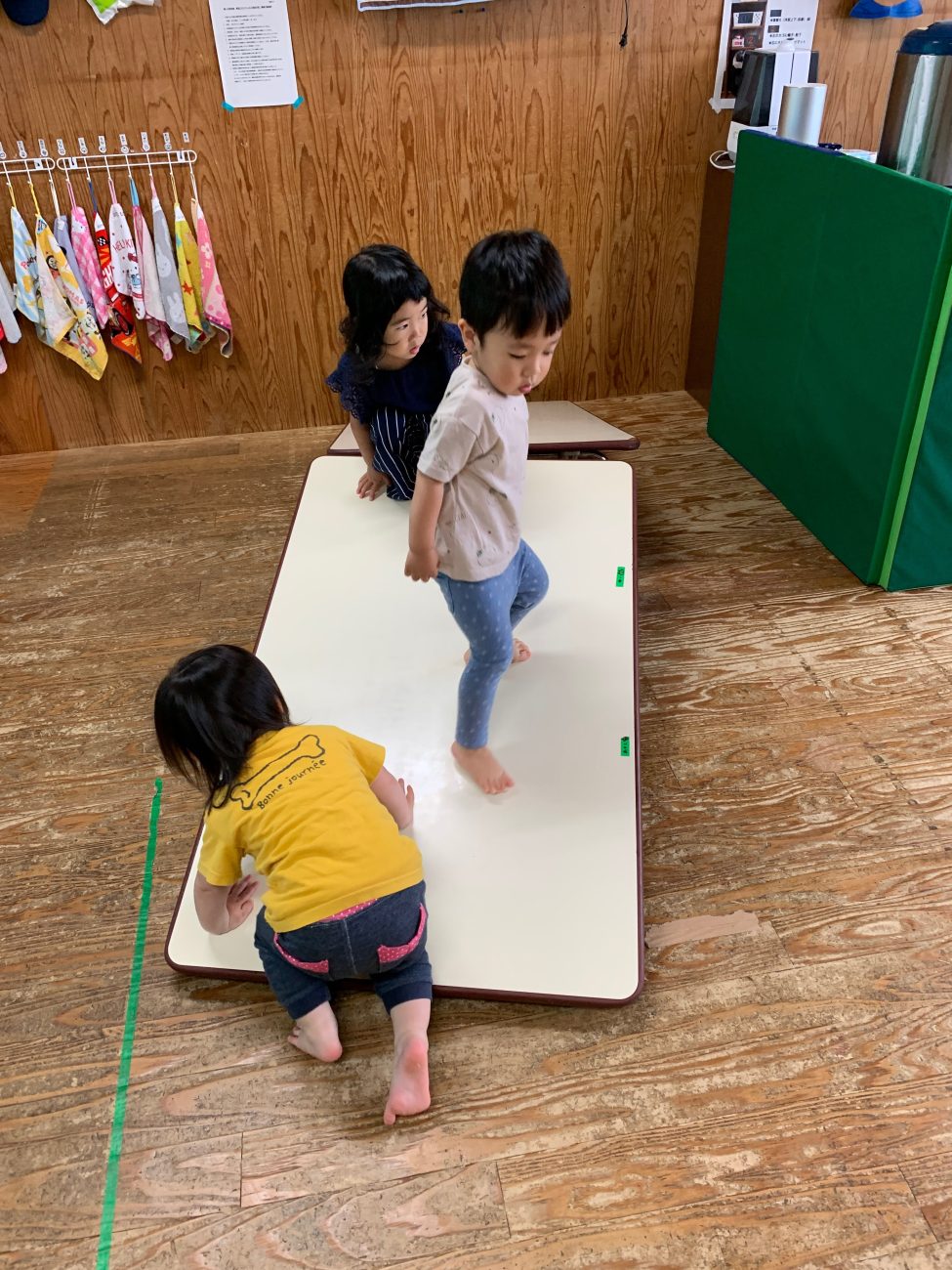子ども達の1番人気は、机で作ったすべり台!!2台の机の片足を畳んで傾斜を作り、山のように合わせたものです。駆け足で登り下りする子やてっぺんまで来たらすべり降りる子、腹這いでよじ登る子やてっぺんから床にジャンプする子など、遊び方、動き方は様々です。