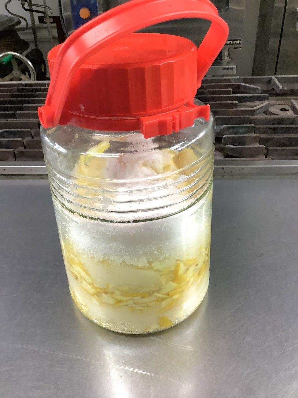 魚の塩レモンムニエルは、4月に作った塩レモンを使用しました。レモンの香りがとても良く、さっぱりとした塩味の効いたムニエルになりました。ご飯がとてもすすむ一品となりました。4月から給食室で丁寧に作った塩レモンが、美味しいメニューへと変わってらとても良かったです。
