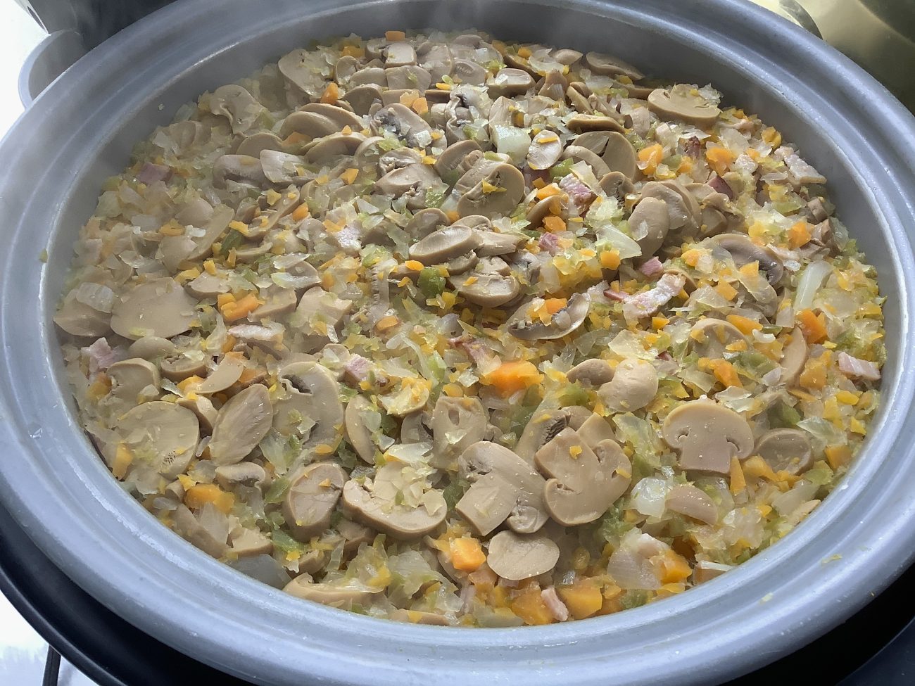 炊き込みピラフは、玉葱・人参・ピーマン・マッシュルーム・ベーコンが入りました。ピーマンは細かくして入れ、またバターを入れることで、ピーマン独特の苦味がなくなり、とても美味しいピラフとなりました。