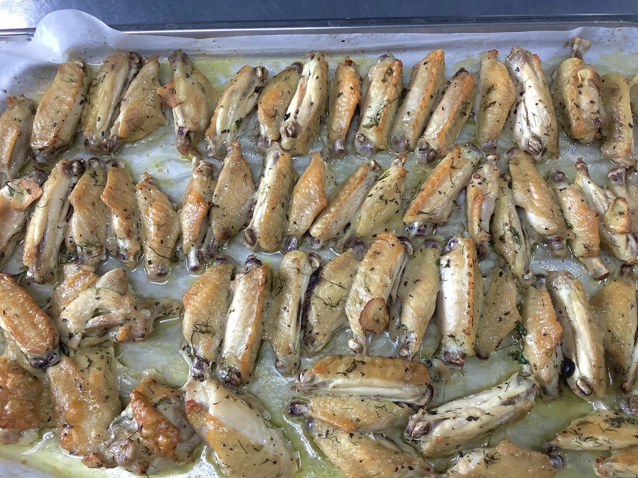 骨つきチキンを4種類のハーブとニンニクで香りをつけ、こんがりと焼きました。ハーブの香りがとても良く、美味しく仕上がりました。骨つきチキンは食べるのが難しいかなと思っていましたが、綺麗に上手に食べてくれていました。