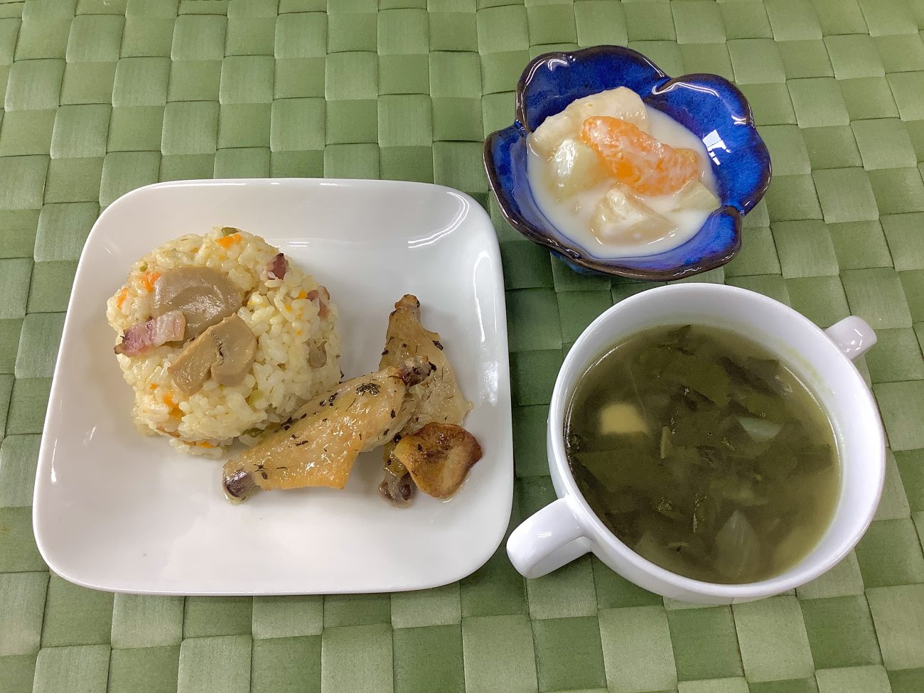 本日のメニューは、”炊き込みピラフ””ハーブチキンバー””モロヘイヤスープ””フルーツヨーグルト”でした。