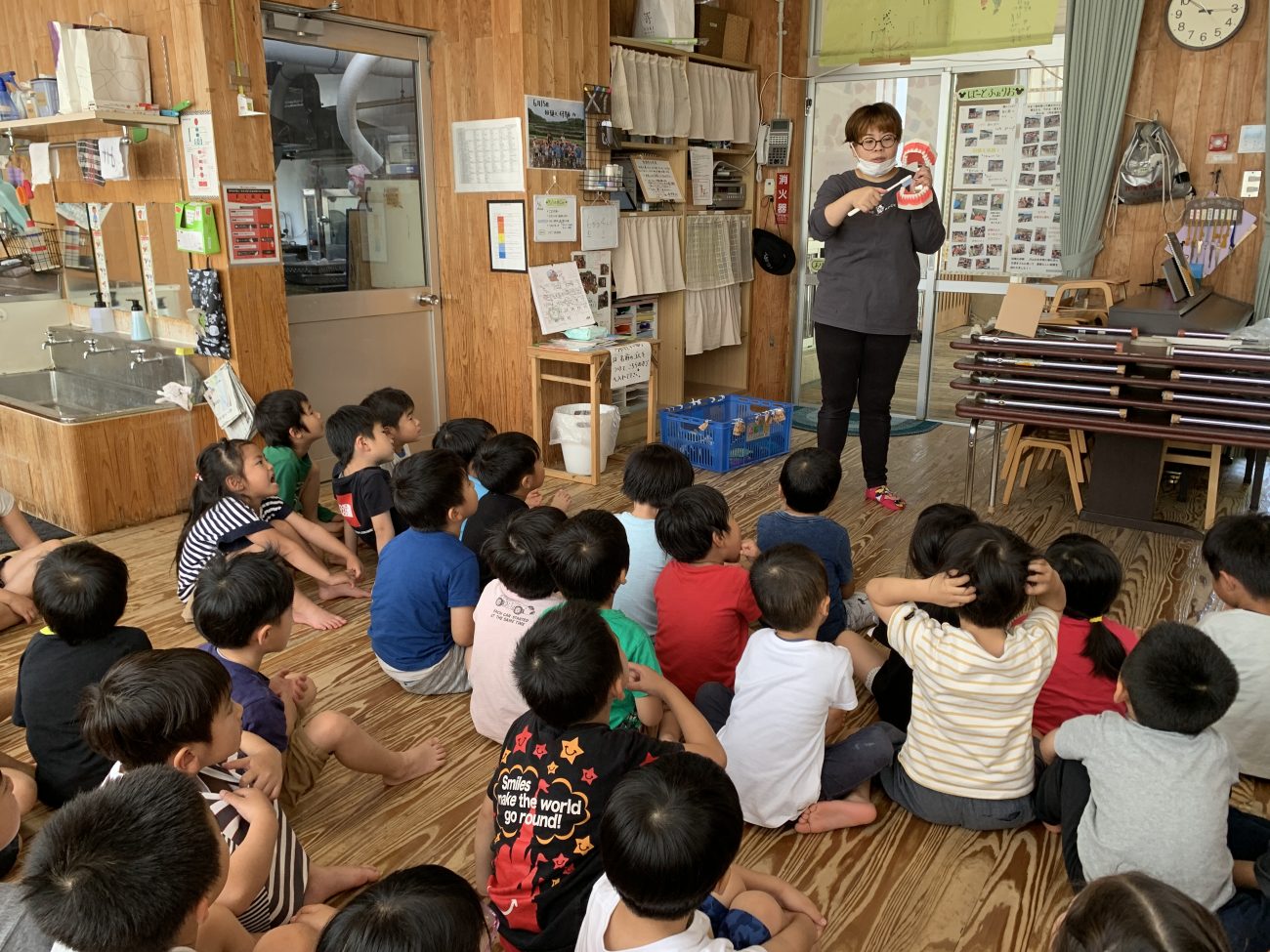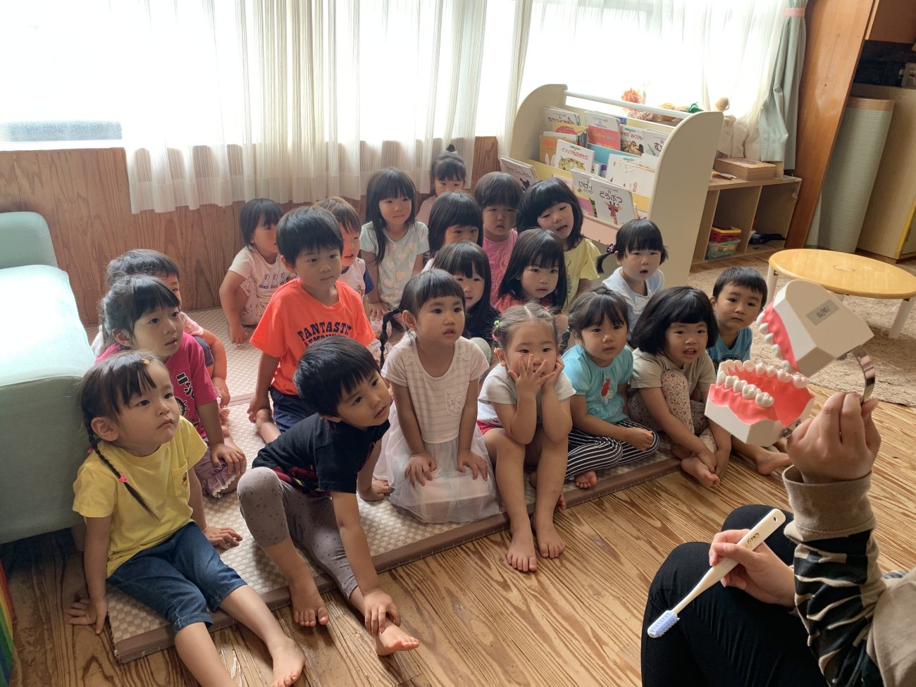 今回、2クラス合同で行いましたが、保育士の話に耳を傾けながら聞いていました。学年が上がるごとに歯磨きの仕方も変化し、しっかりと磨くことができるようになります。