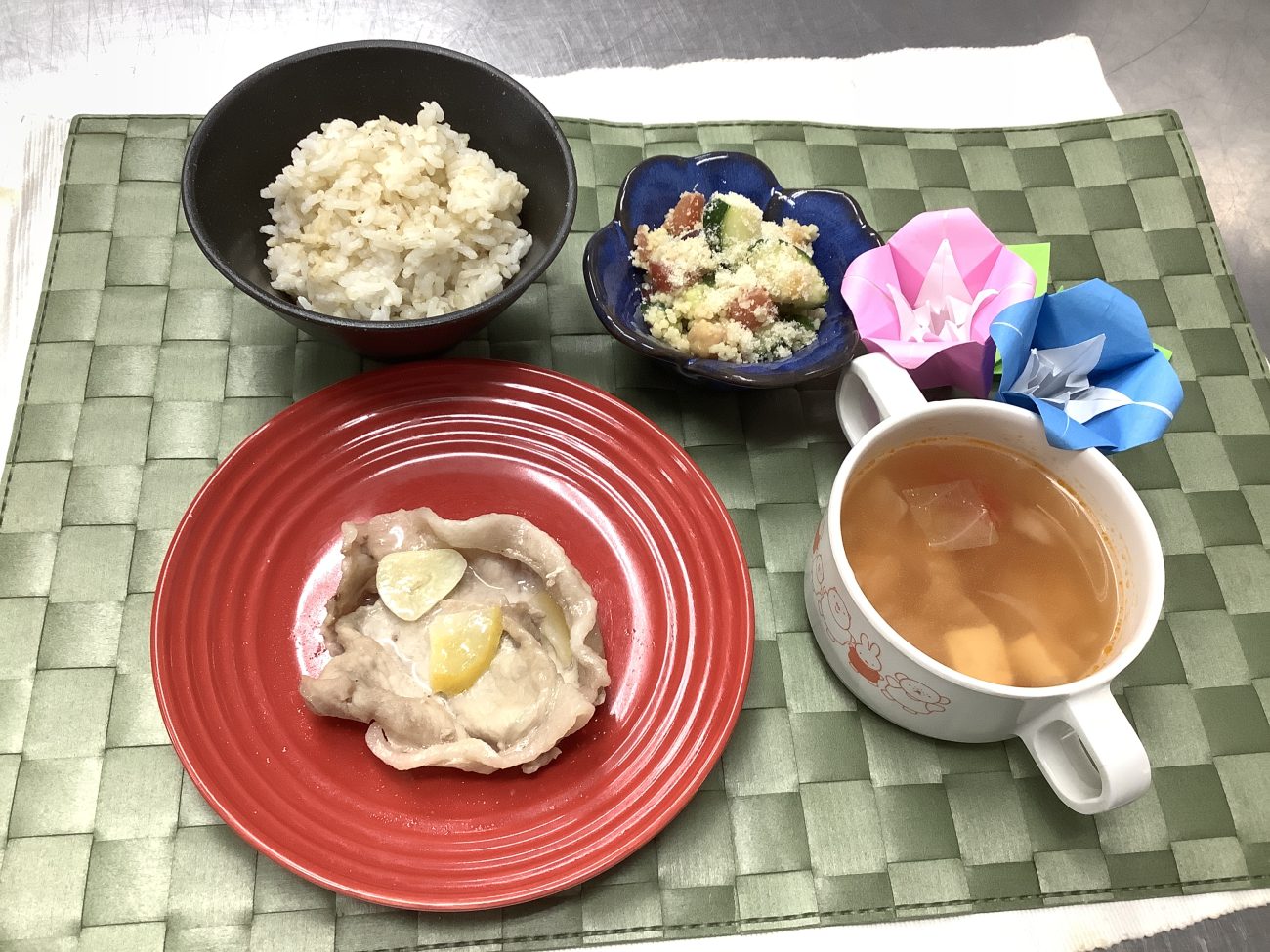 本日のメニューは”豚肉の塩レモン蒸し””ひよこ豆のクスクスタブレ””トマトスープ”
