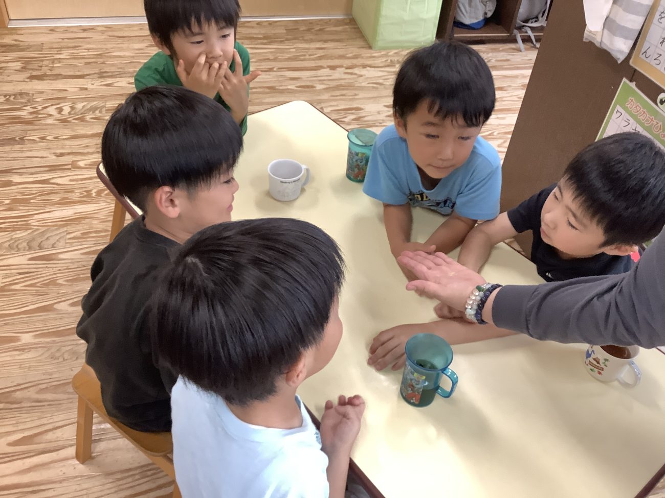 タブレは、クスクスを使い野菜を沢山加えたサラダ感覚で食べられる料理で、フランスの国民食となっています。子どもたちに火を通す前のクスクスを見てもらいました。みんな興味津々な様子で釘付けになっていました。