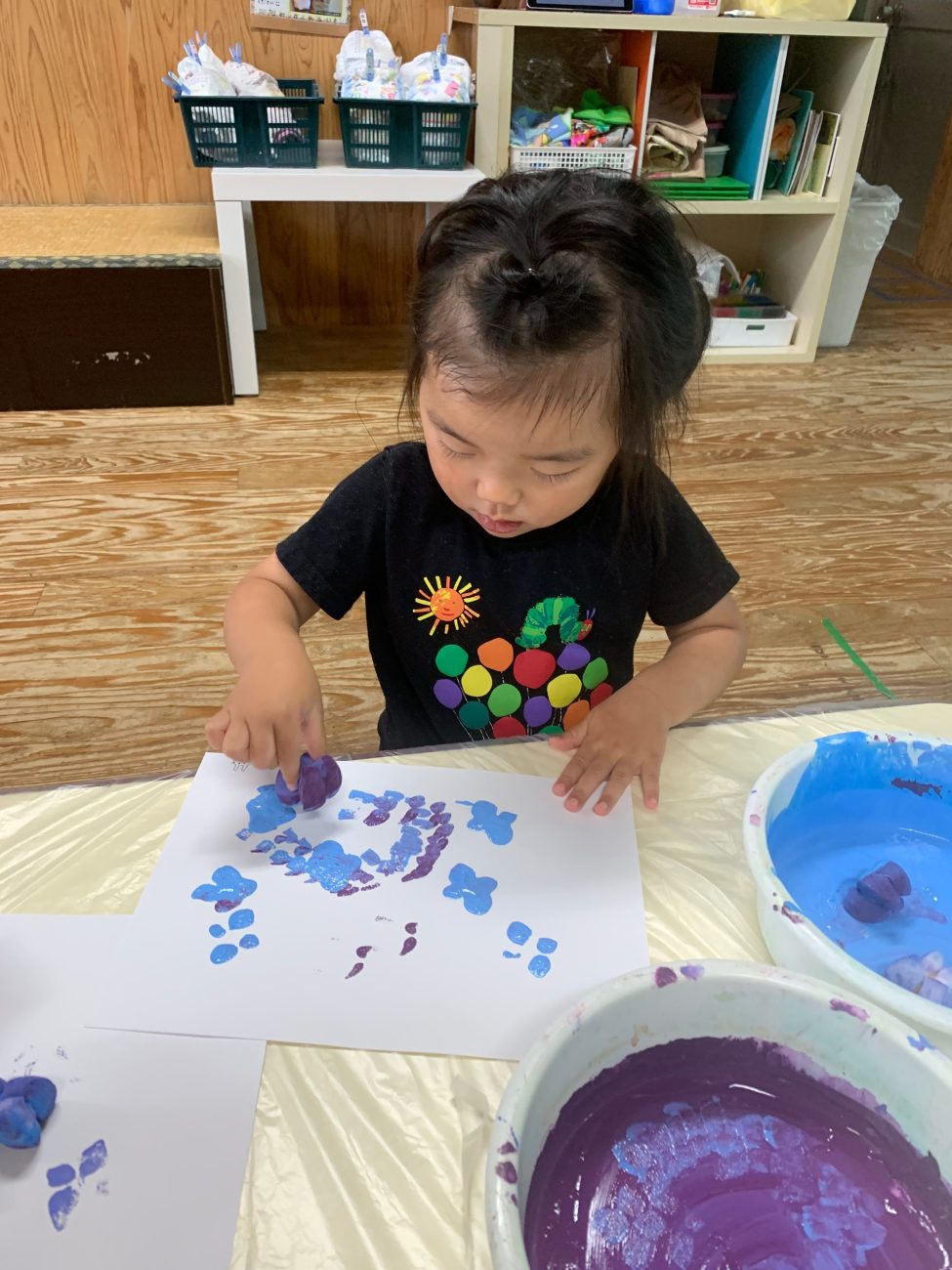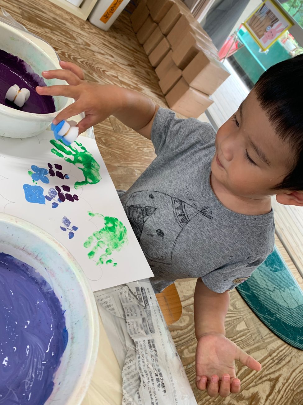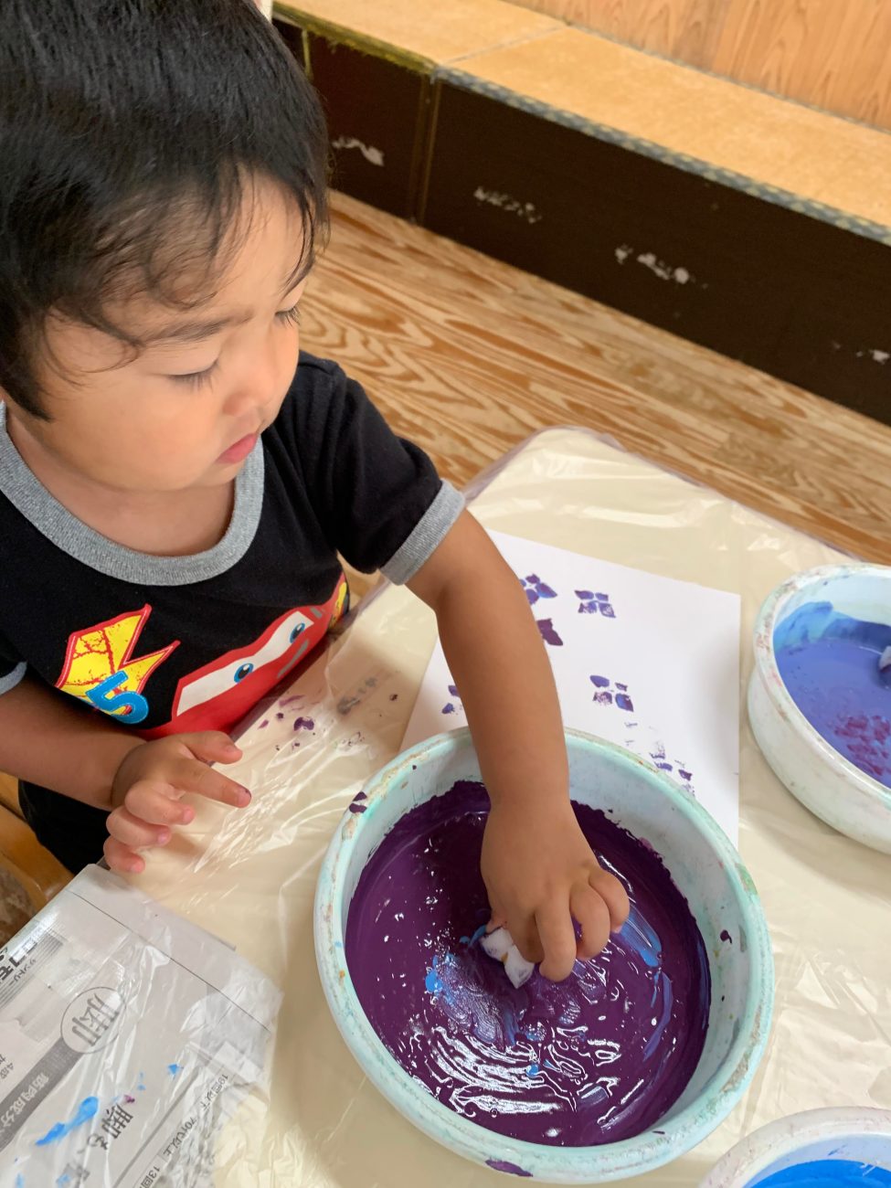 スタンプを力強く押すと絵の具が溢れ出てくるのに気づいた子は“優しく優しく”と優しく押してあげると綺麗にできるよということを教え合いながら楽しんでいる姿もありました。