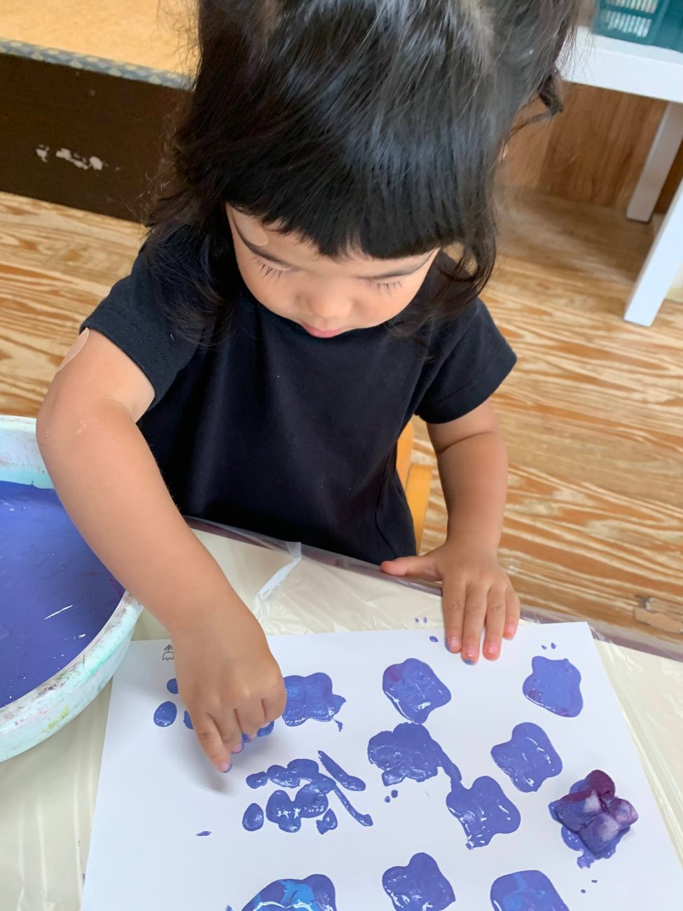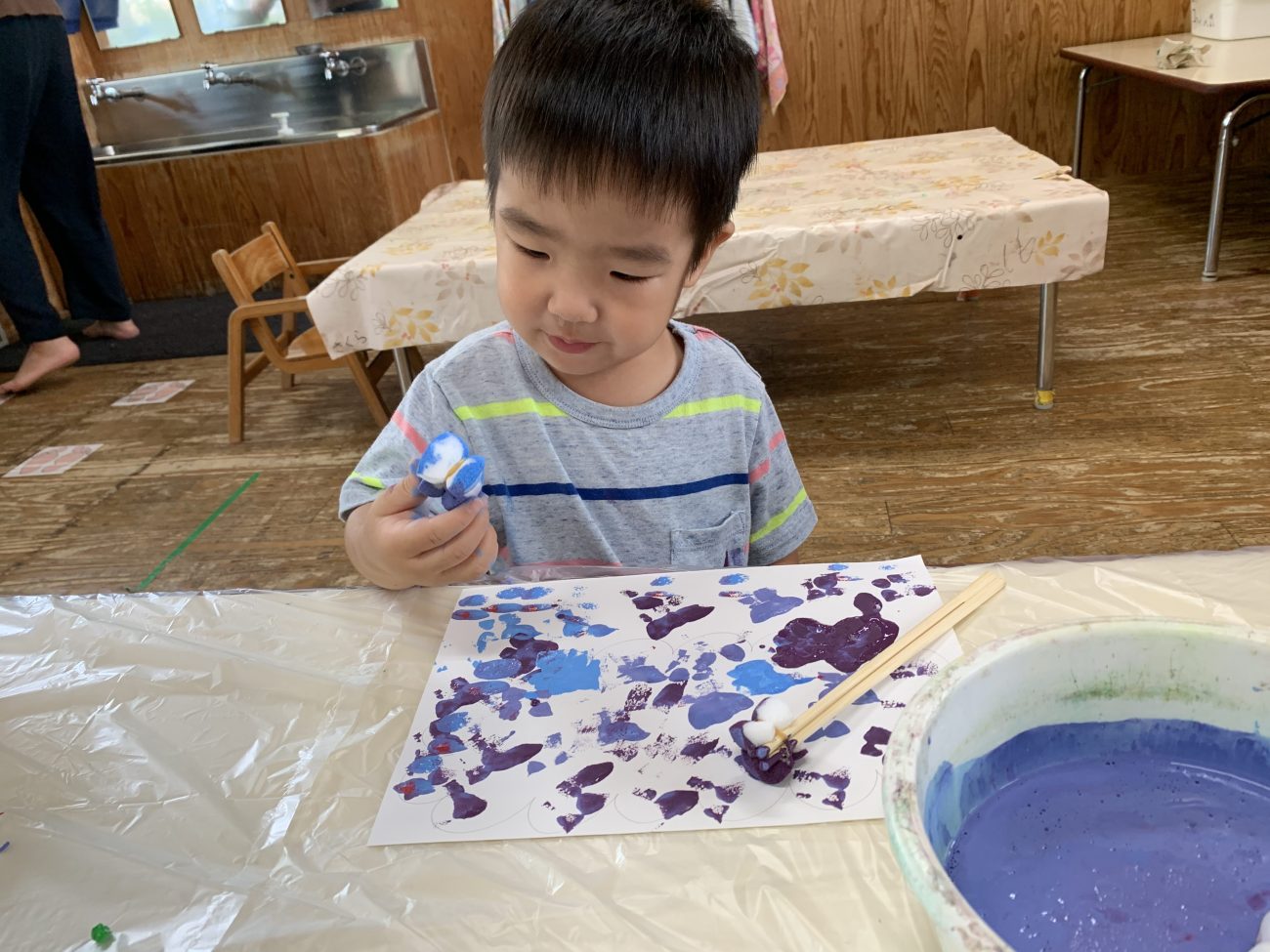 絵の具を紫、薄紫、水色と三色用意すると3色を使い分けていました。また紙の上で色が混ざることに気づき「なんか色が変わったね〜」と話している子もいました。