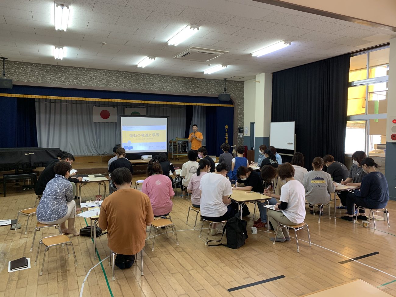 6/19(土)園内研修「リトミックの動きから見る運動発達」を行いました。講師として竹原亮紀さんをお招きし、参加者は錦ヶ丘保育園・認定こども園錦ヶ丘・まふぃん(上之園・錦ヶ丘)の職員でした。4施設揃うと人数も多く、密を避けるため二部構成・常時換気で行いました。