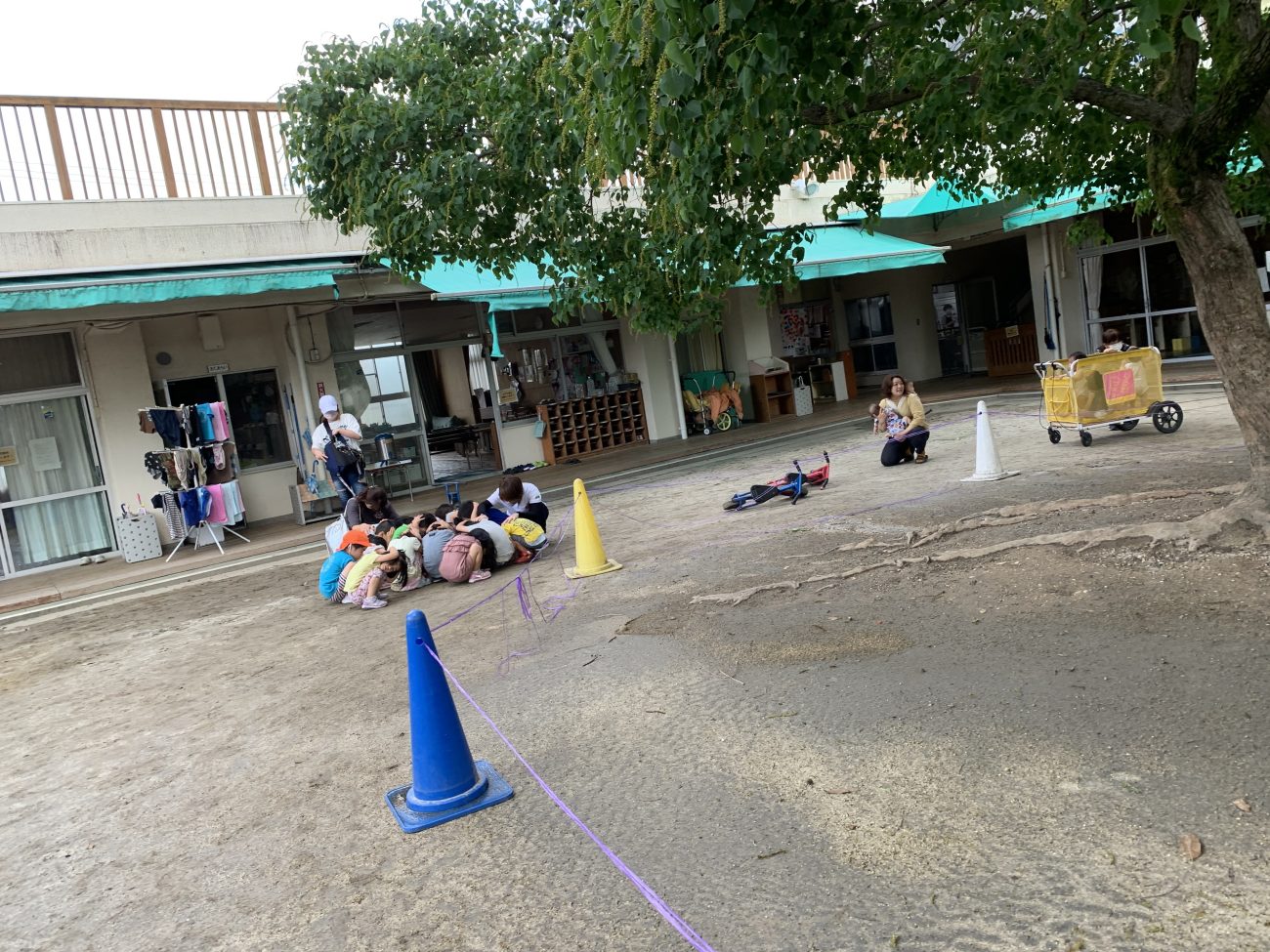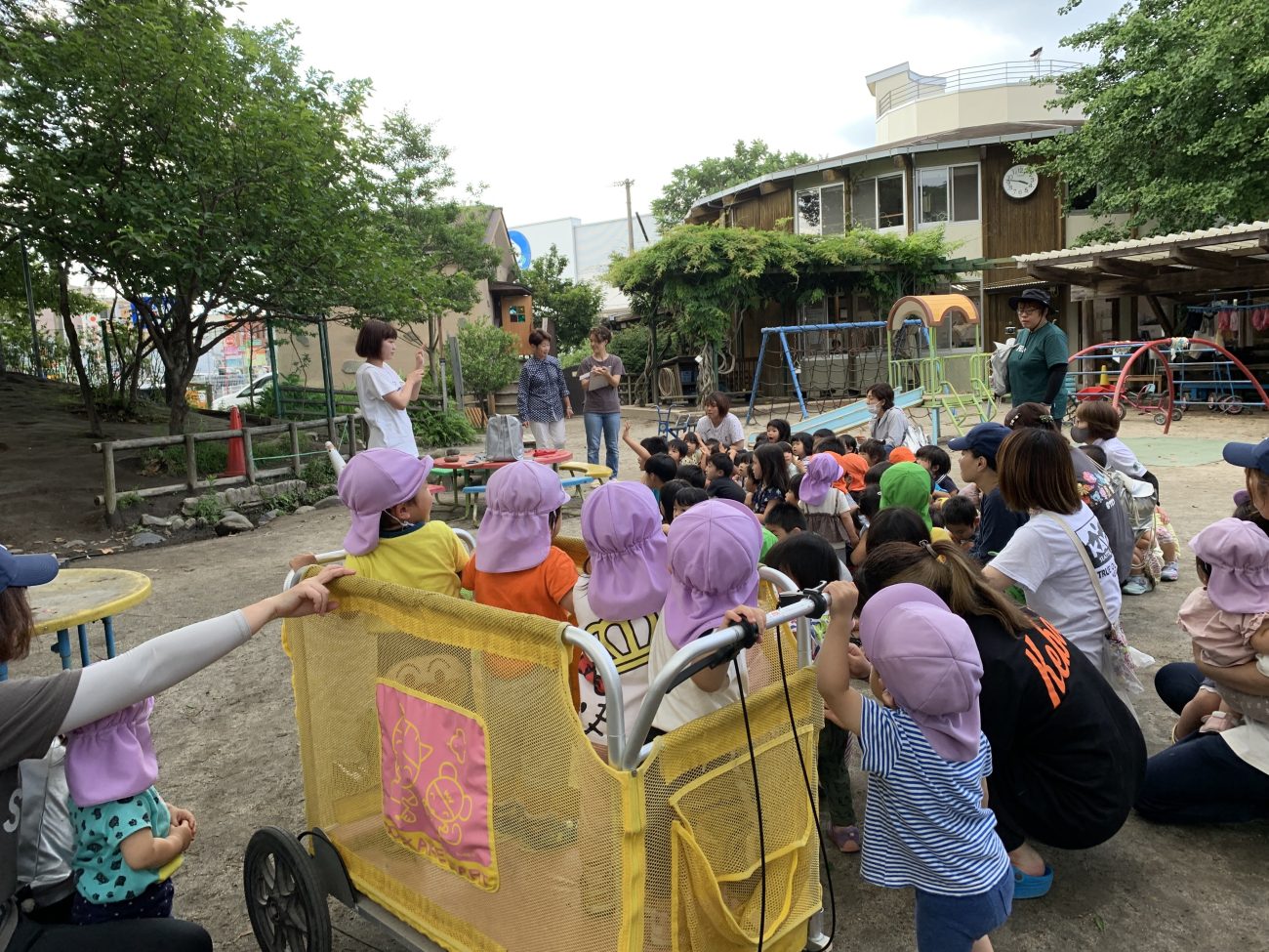 6月29日(火)戸外遊び中に地震が起きたことを想定した避難訓練を行ないました。保育者の話を聞き、安全に避難すること、落ち着いて行動することができました。