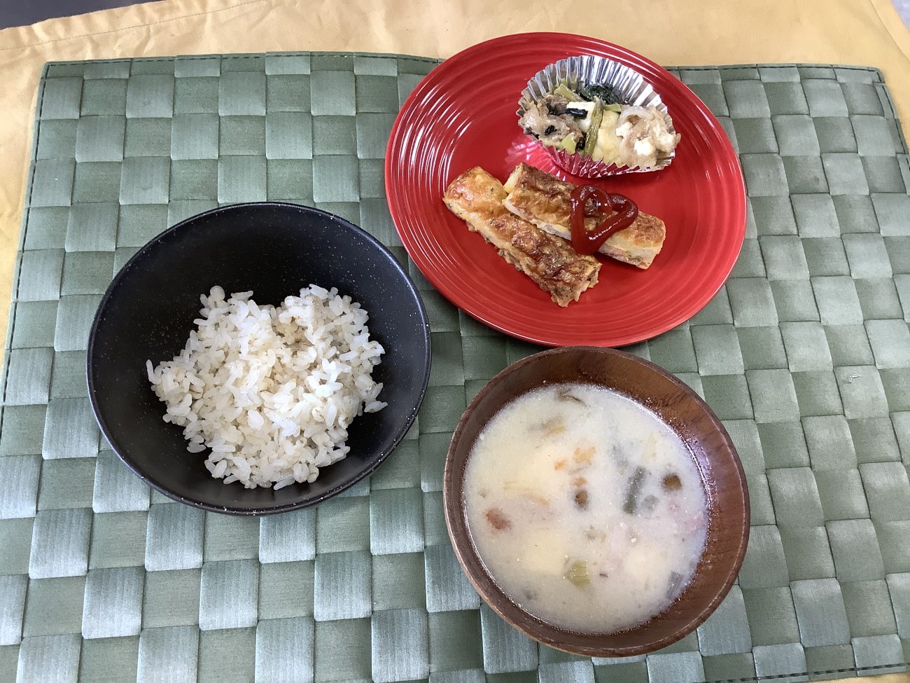 豆乳汁は、鰹節と昆布の出汁で、ベーコン.玉葱.トマト.いんげん.なめこ.絹ごし豆腐を煮込みました。最後に、豆乳を入れて、白味噌と隠し味に醤油を少し入れて味を整えました。みんな大好きな豆乳汁で、沢山食べてくれました。