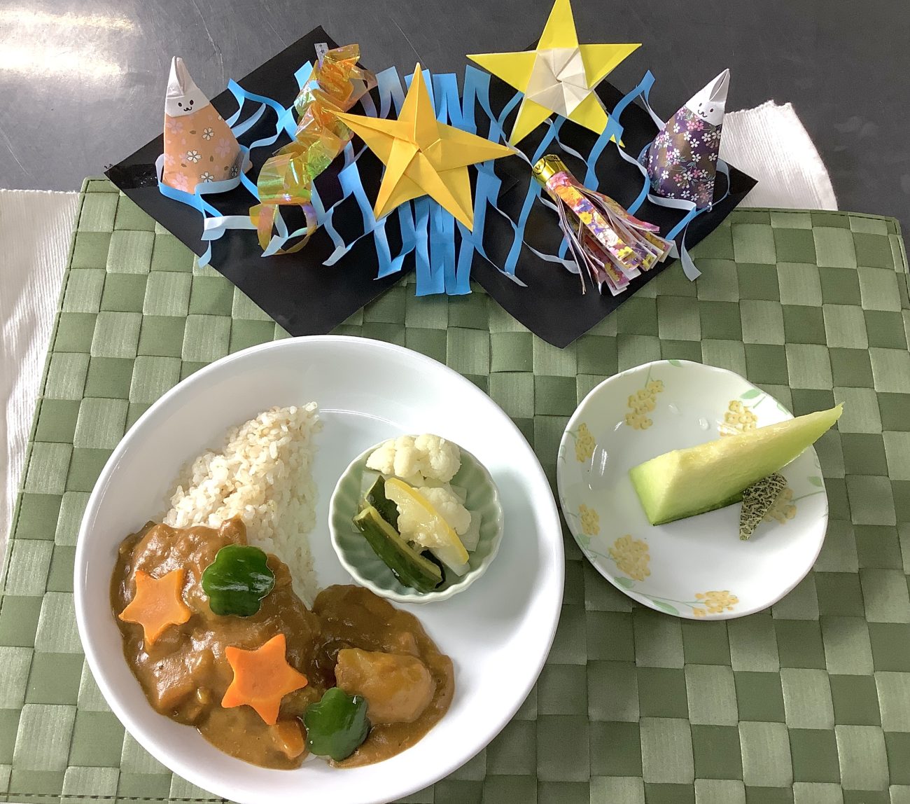 ポークカレーは、子どもたちの大好きなメニューの一つとなっています。今回は、7月7日で「七夕」だったため、人参を星型にして提供しました。普段、人参が苦手な子が星型になっている人参をみて、パクっと食べてくれたという話を聞き、とても嬉しく思いました。